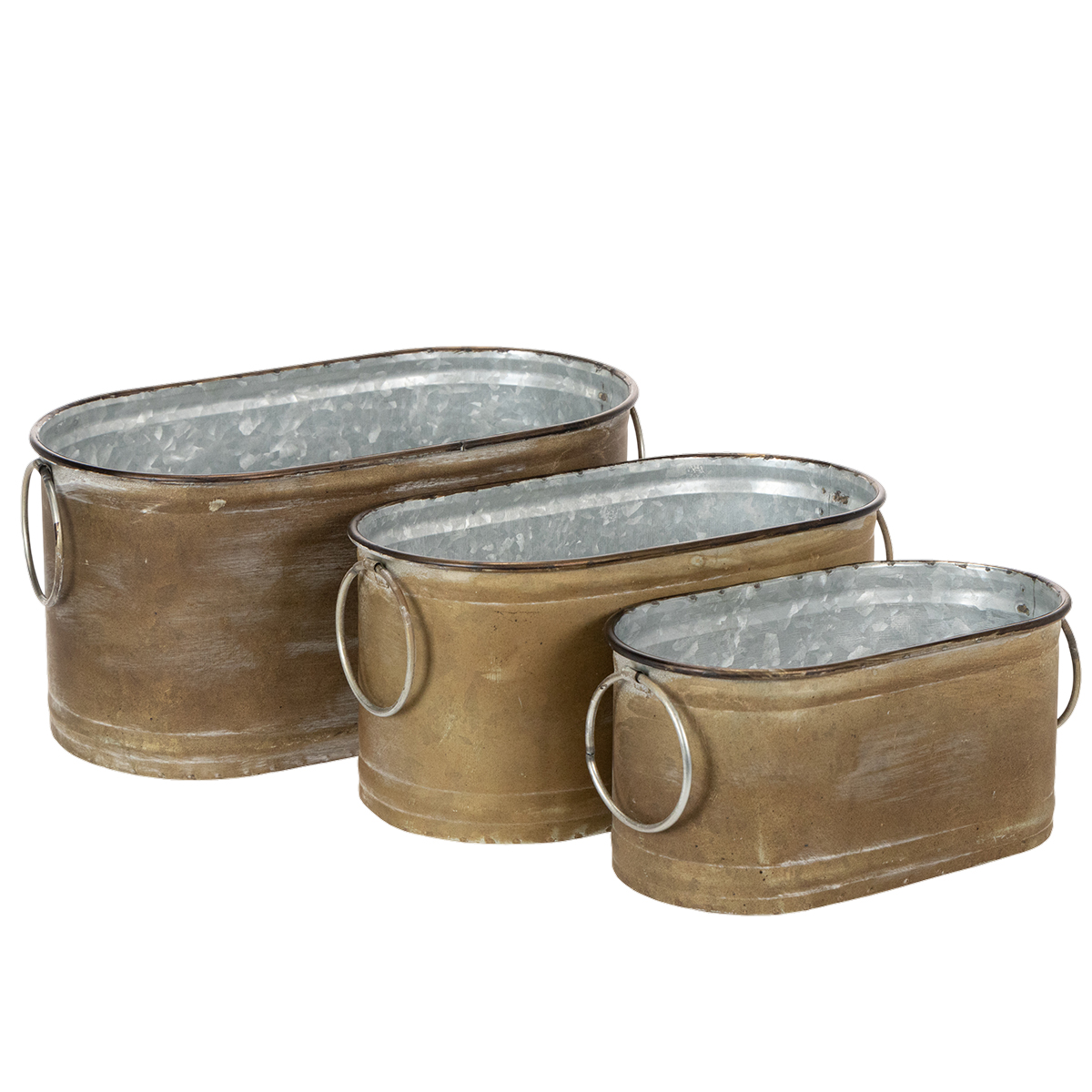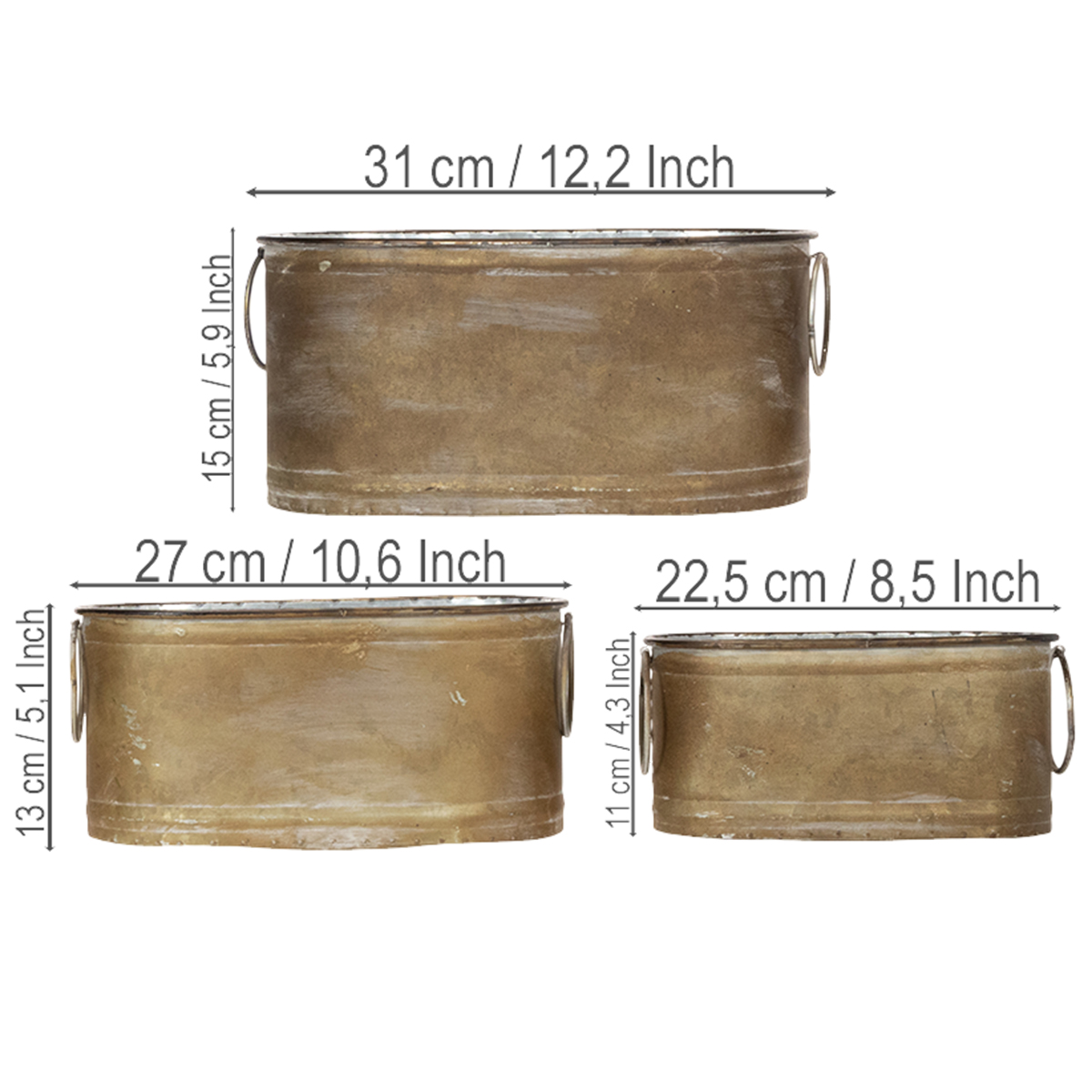 Kolmen erikokoisen peltitarjottimen soikea muoto jättää runsaasti tilaa lukuisille pöytäkoristeille. Täytä retroruukut vaahdolla ja lisää joukkoon erilaisia kuivattuja kukkia tai silkkikukkia.