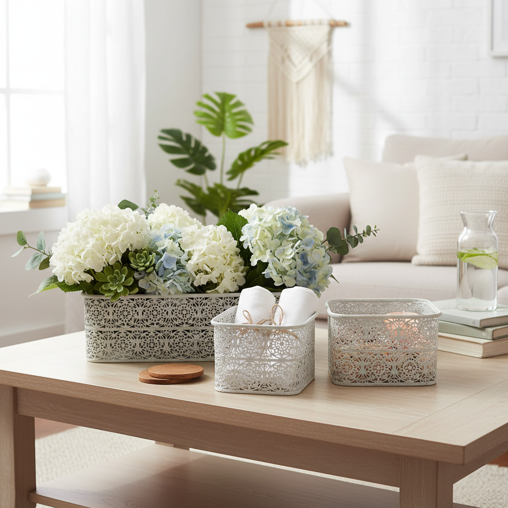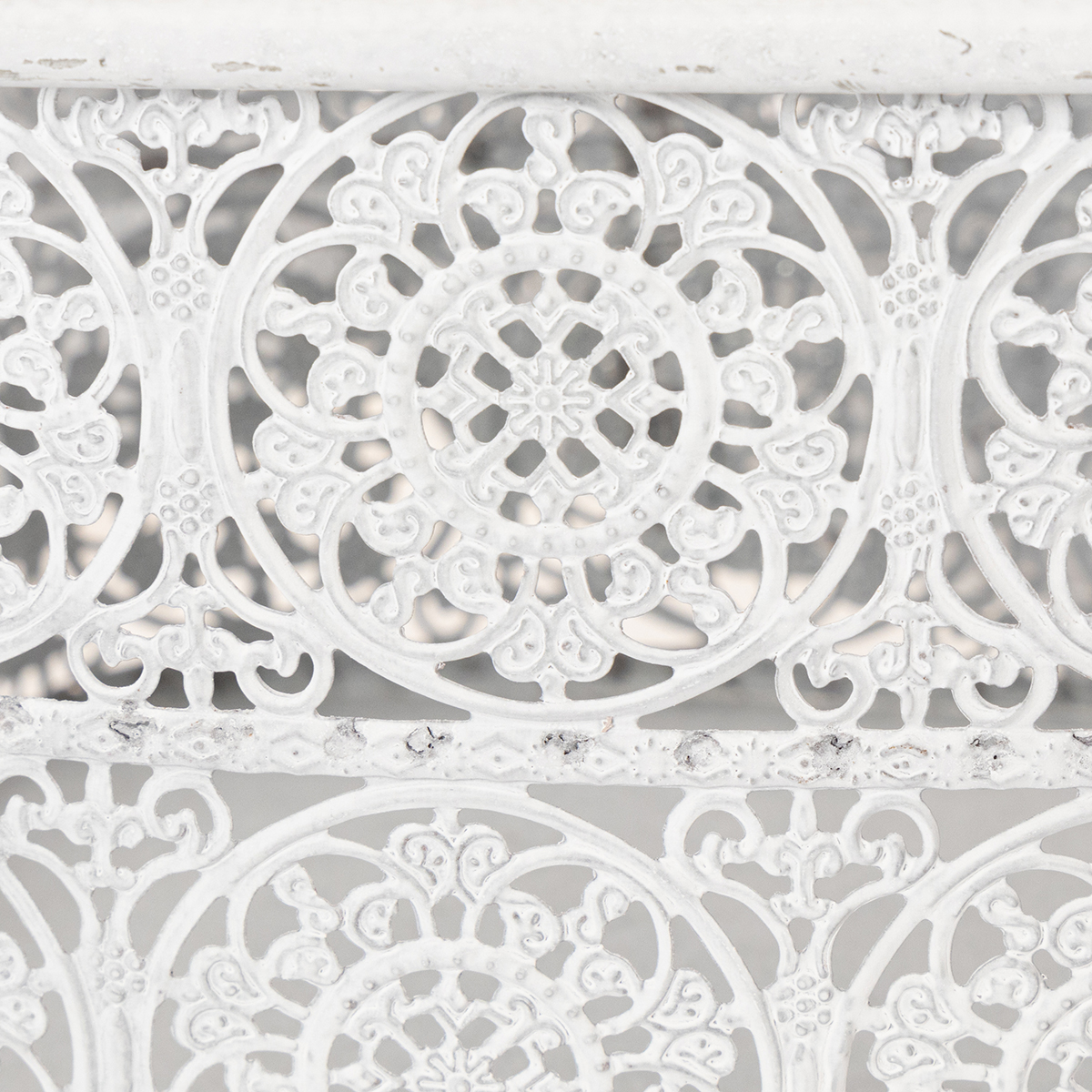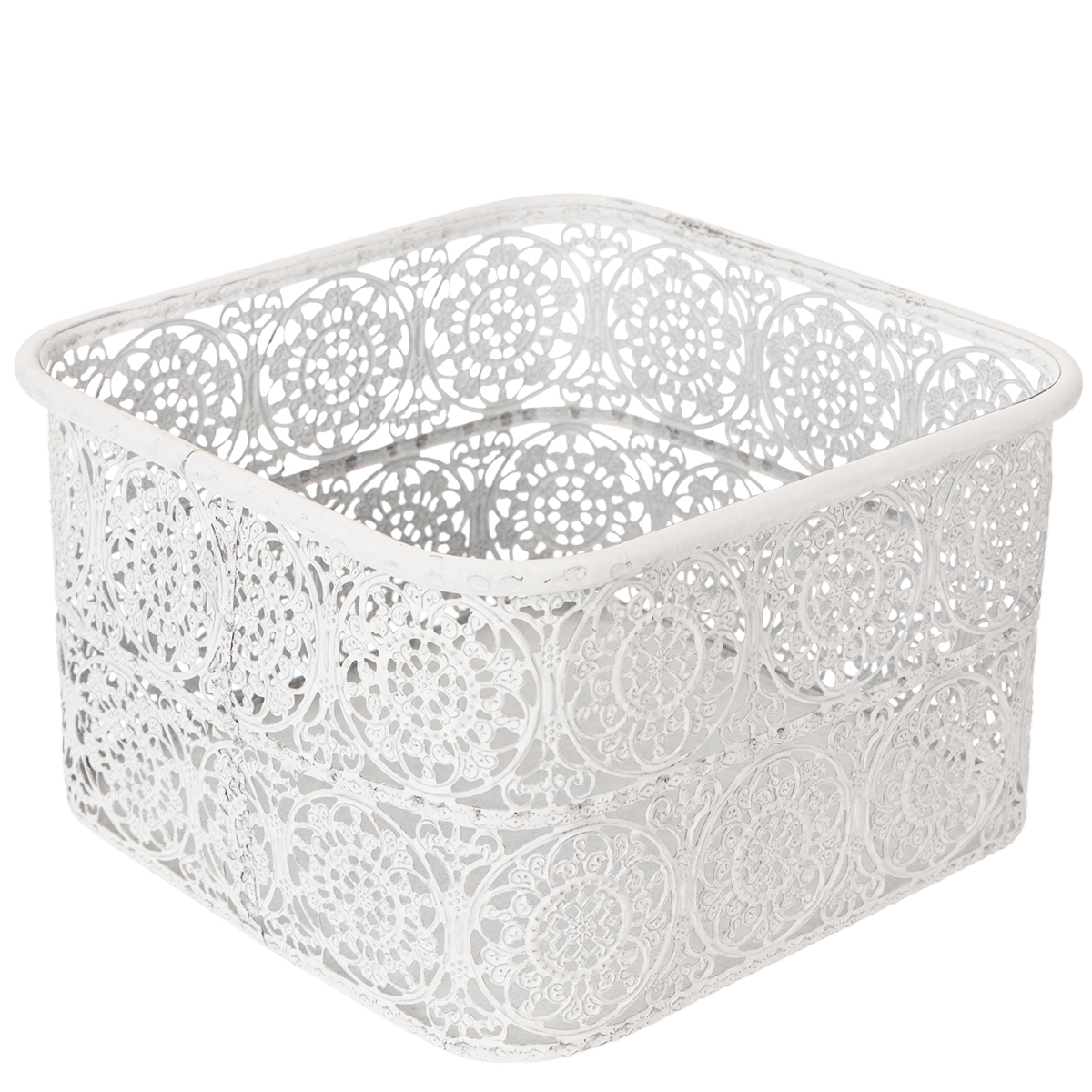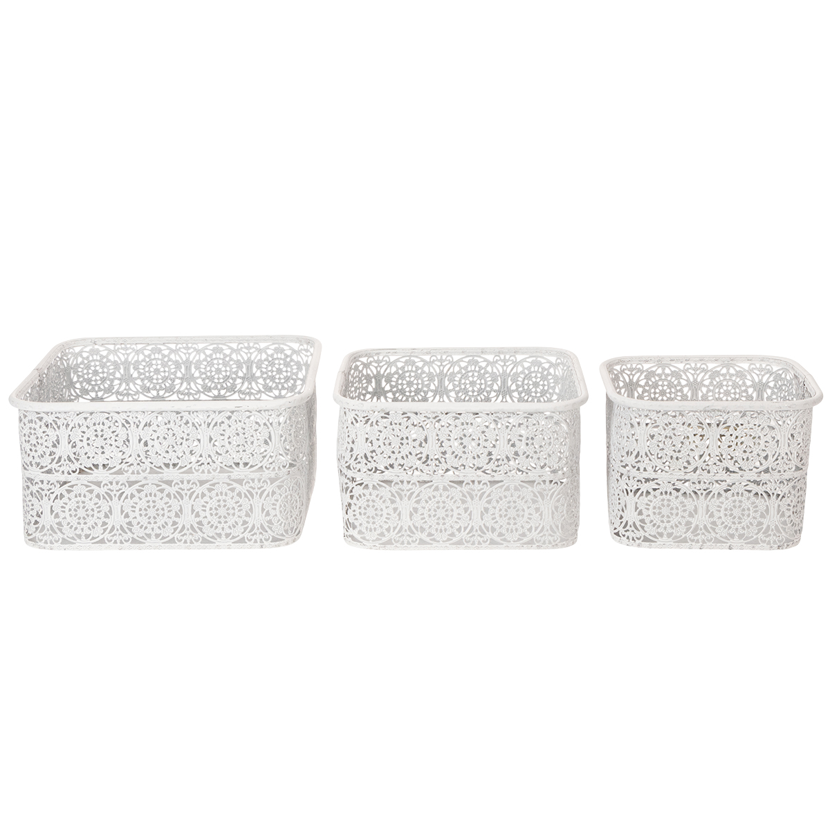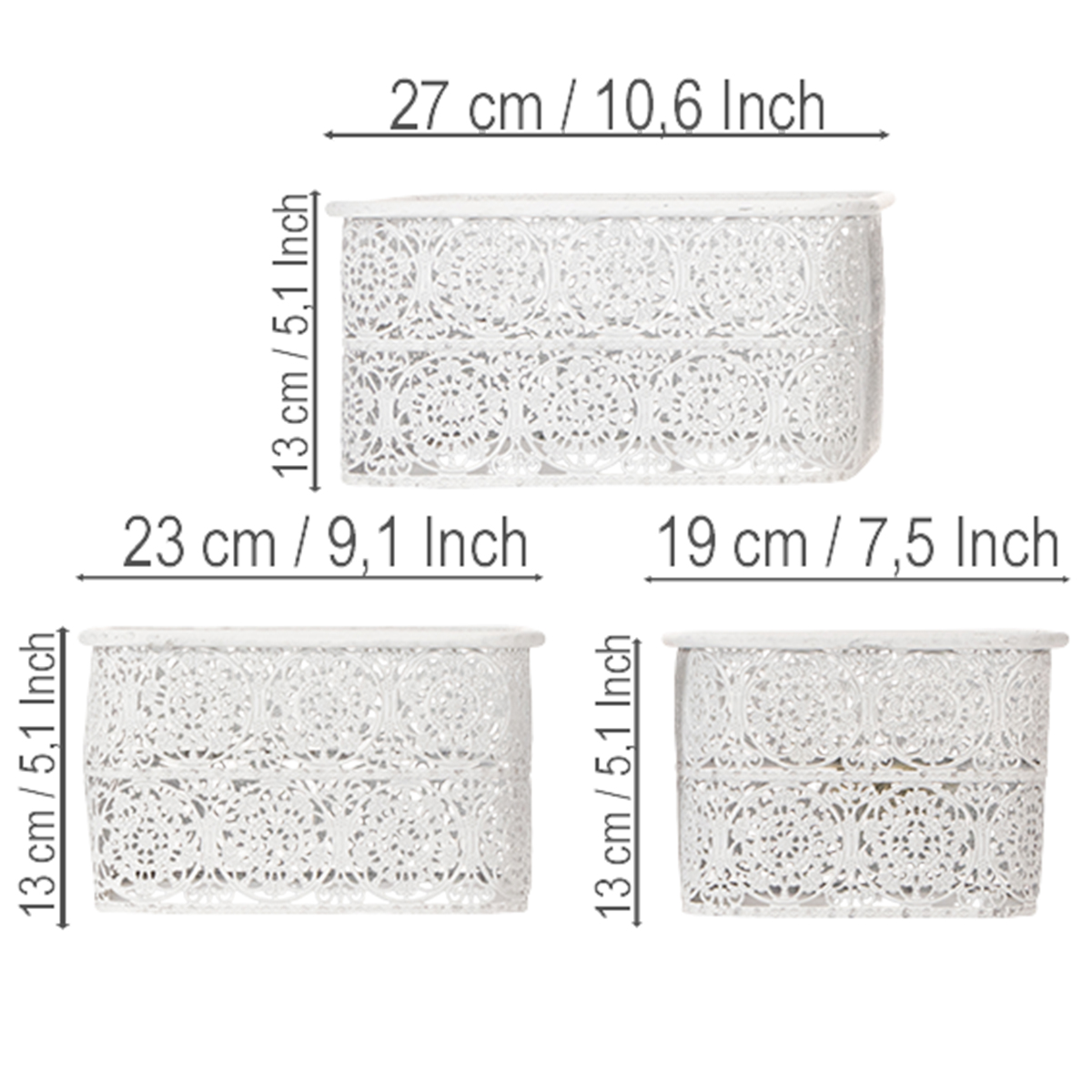 Metalliset pitsikuvioiset kulhot, koristeellinen rasia, neliönmuotoinen, shabby chic, valkoinen, 27/23/19 cm, korkeus 13,5 cm, 3 kpl setti