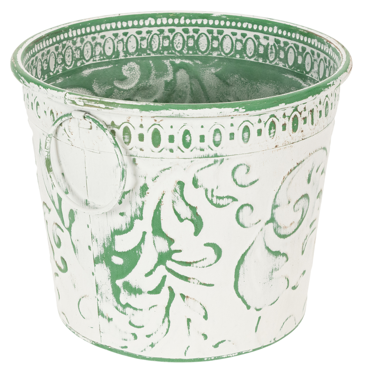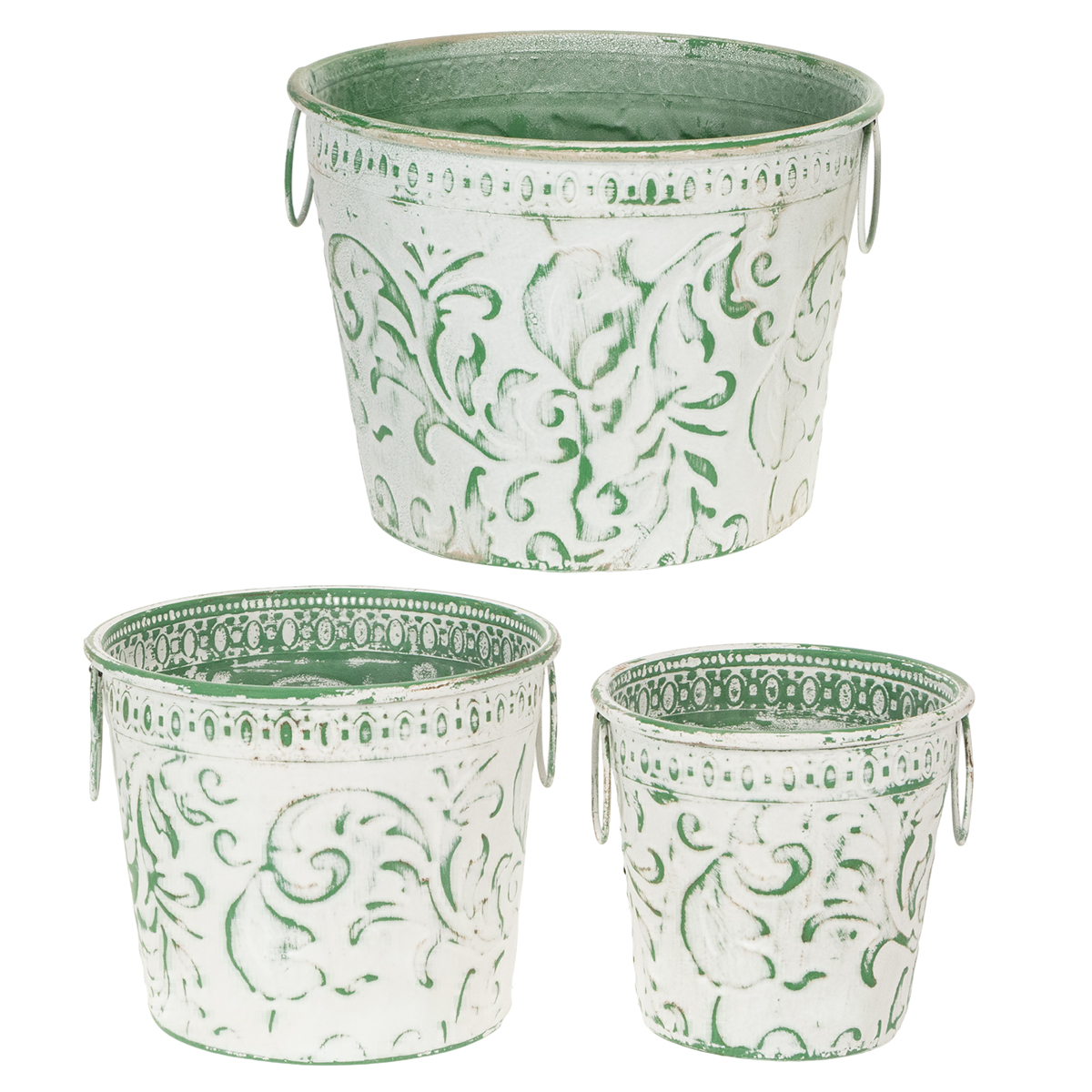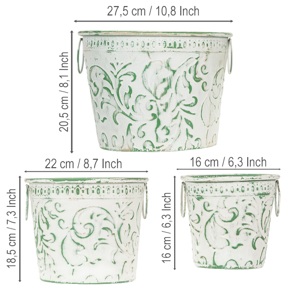Nämä kahvoilla varustetut metalliset ruukut toimitetaan käytännöllisissä 3 kappaleen setissä! Maalaismaiset kohokuvioidut ruukut on suunniteltu trendikkääseen shabby chic -ruukkuihin, jotta koristeruukkujen vihreä maali näkyy epäsäännöllisen valkoisen pesun läpi, erityisesti reunoissa ja kohokuvioituna.