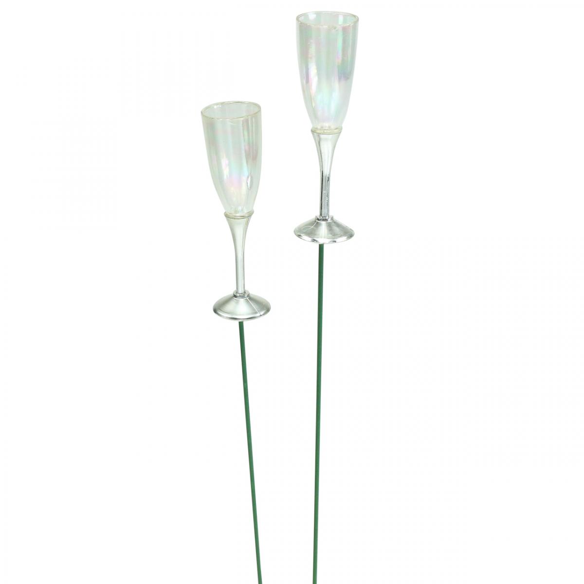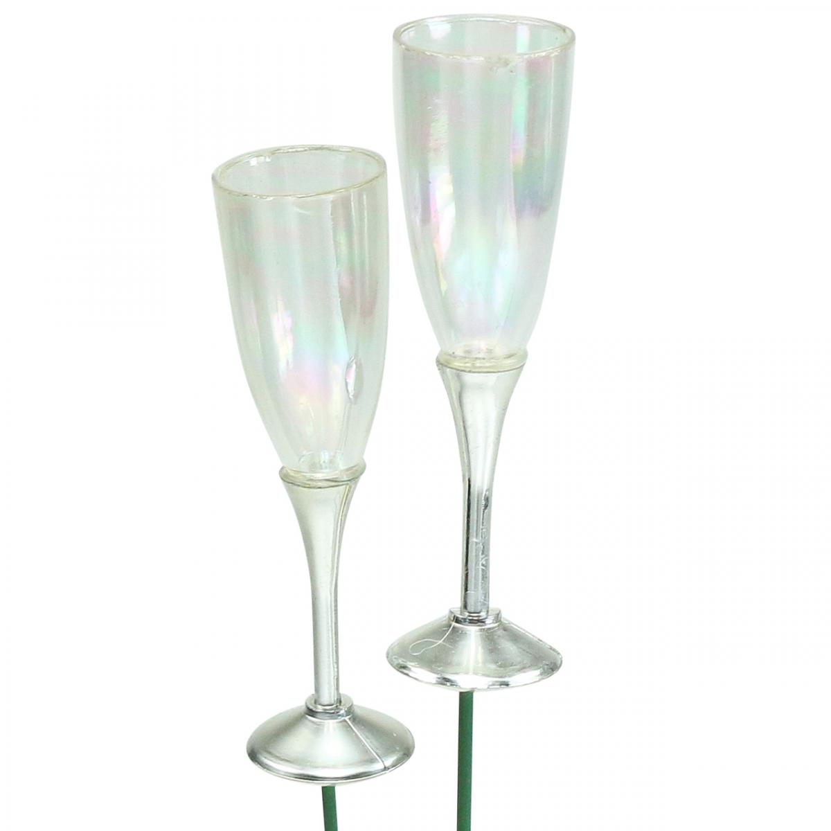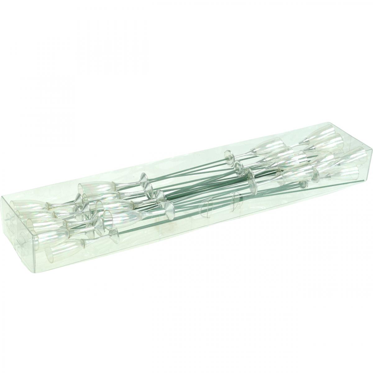 Minisamppanjalasi on laatikossa, jossa on yhteensä 24 kappaletta ja jokainen koristelasi on noin 7,5 senttimetriä korkea. Vihreällä sauvalla kokonaispituus on noin 25,5 senttimetriä. Halkaisija on noin 1,5 senttimetriä. Näin voit käyttää samppanjalaseja loistavana pöytäkoristeena, jos kiinnität muovilasit kimppuun tai asetelmaan pöydän keskelle uudenvuodenaaton koristeeksi ja lisäät siihen hopeakimalle, serpentiinit ja neliapilat tai koristefiguurit.