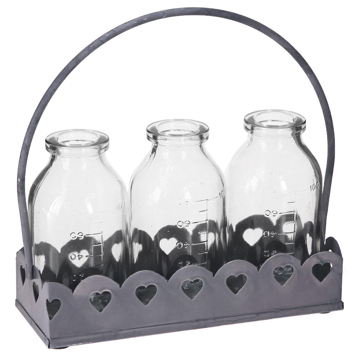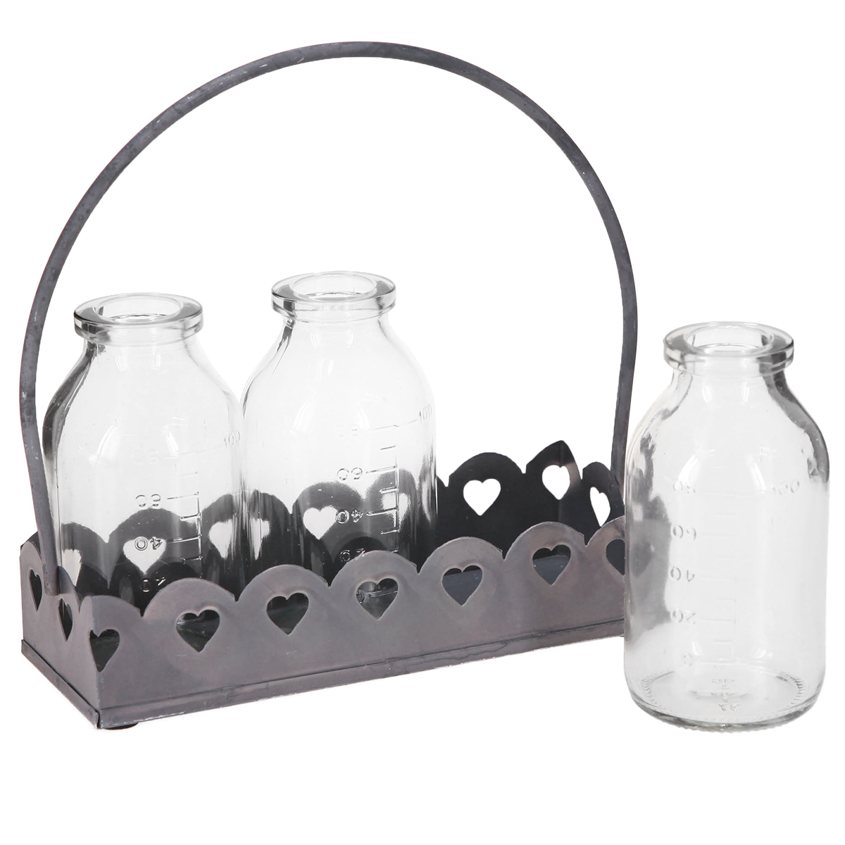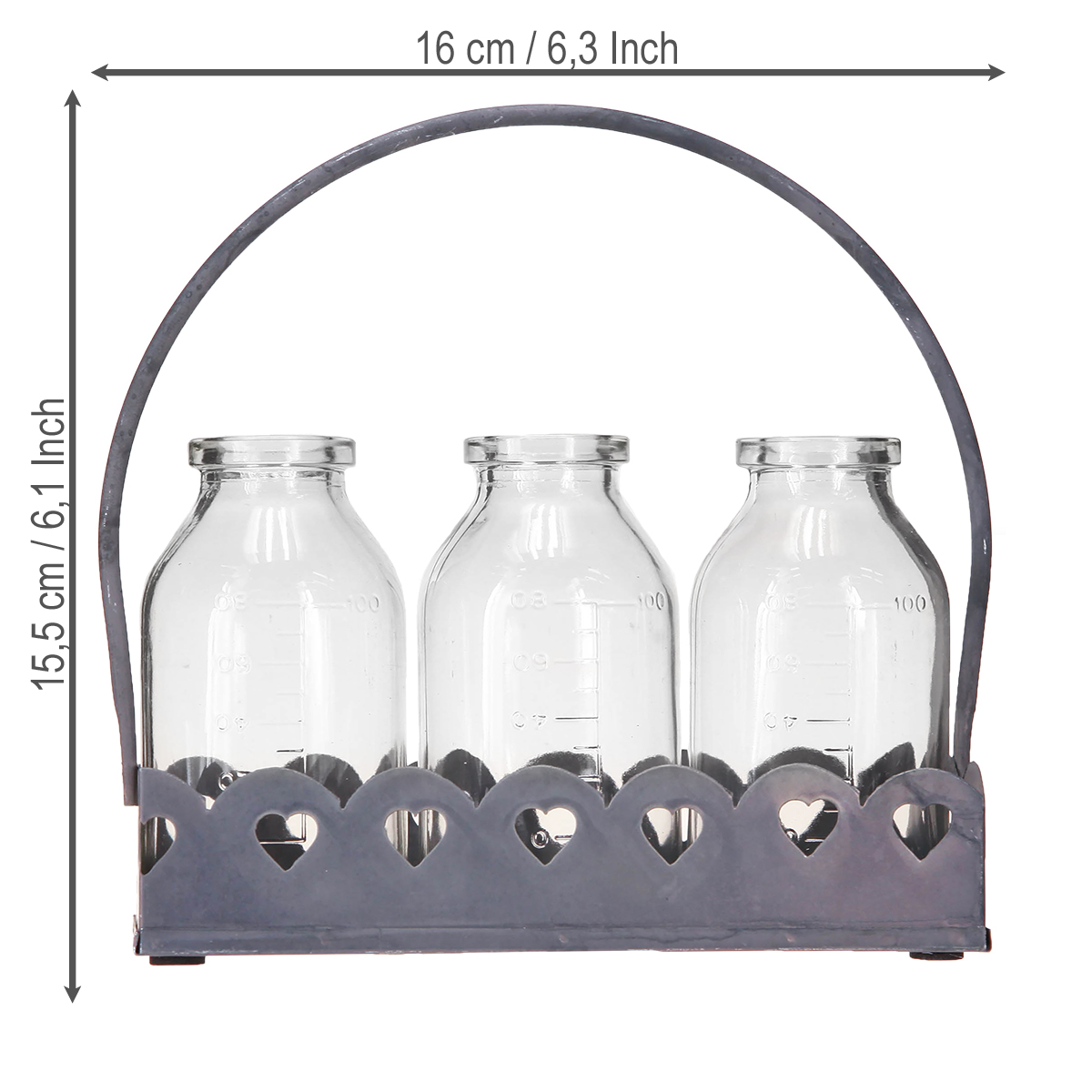 Koe minipullokoristeiden maaginen viehätys maljakoina tarjottimella. Nämä viehättävät koristepullot sopivat täydellisesti lisäämään ripauksen nostalgiaa asuintilaasi. Kaikki kolme lasimaljakkoa muistuttavat antiikkisia apteekkipulloja ja asetetaan tukevalle, harmaalle metallitarjottimelle, jossa on rei'itetyt sydänaiheiset kuviot. Tämä retrotyylinen yksityiskohta lisää asetelmaan romanttista silausta, joten se sopii erinomaisesti hääkoristeisiin, kodikkaisiin pöytäkoristeisiin tai lahjaideaksi. Pullojen mitat tarjoavat monenlaisia käyttötarkoituksia pienten kukka-asetelmien nopeasta istuttamisesta yrttien tai askartelumateriaalien säilytykseen.