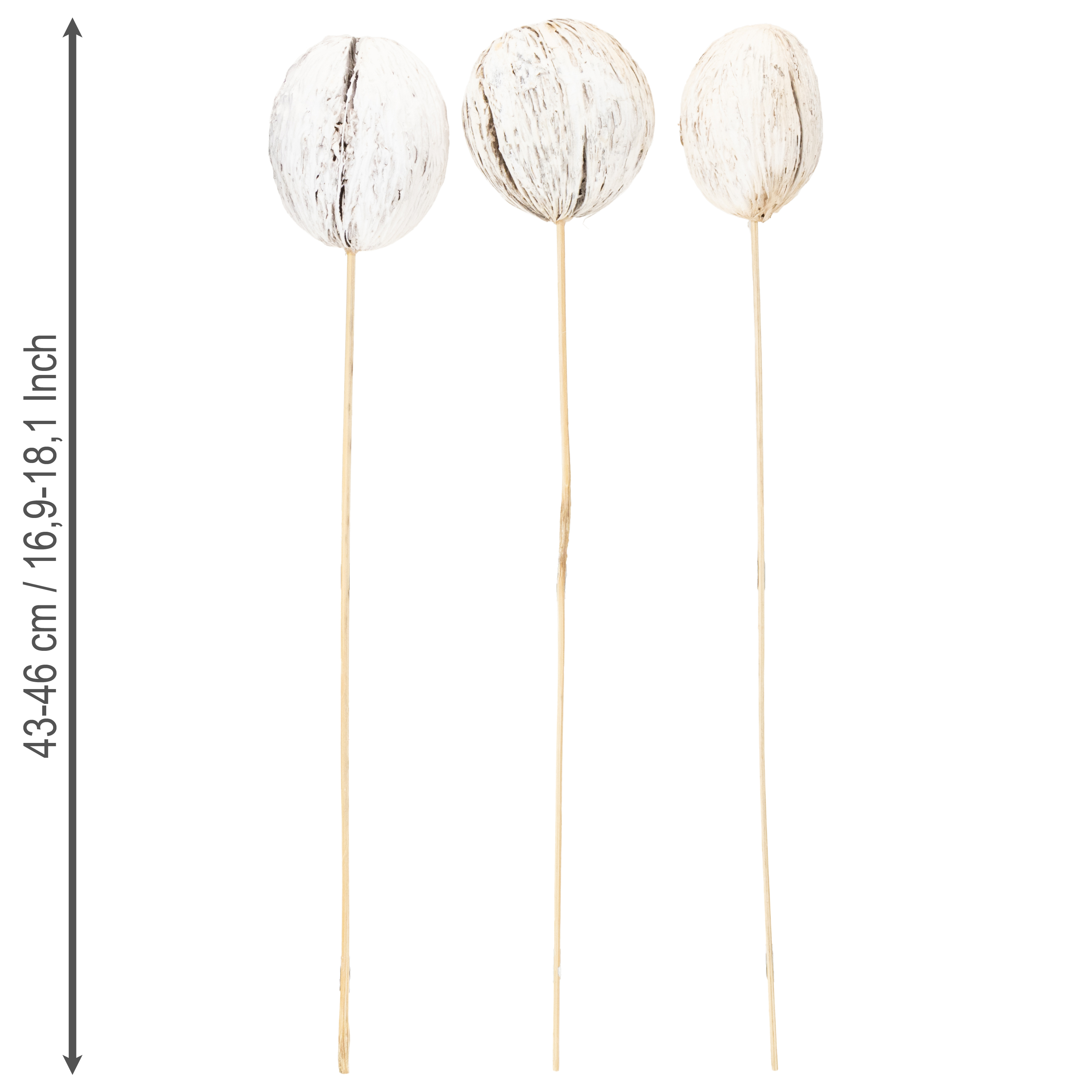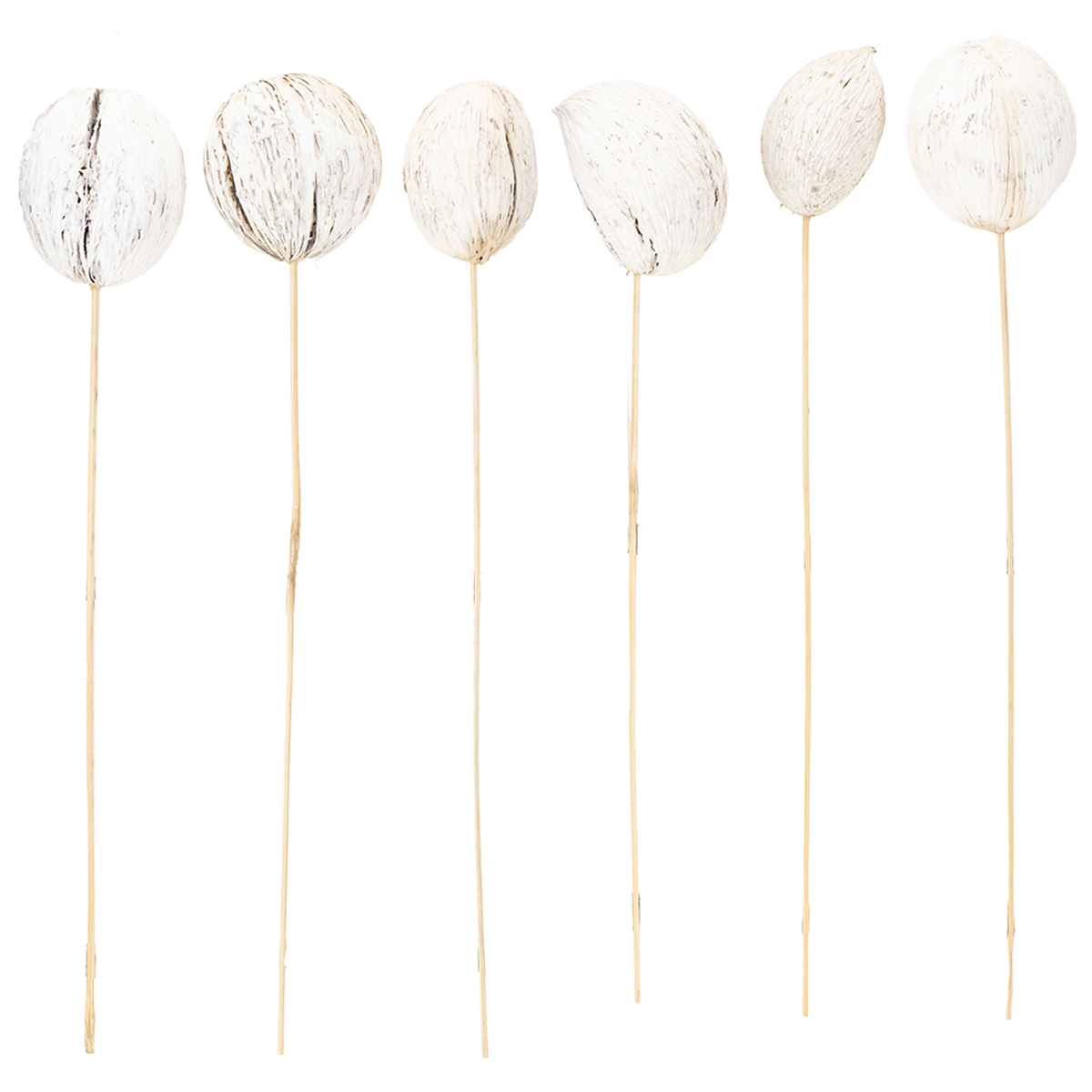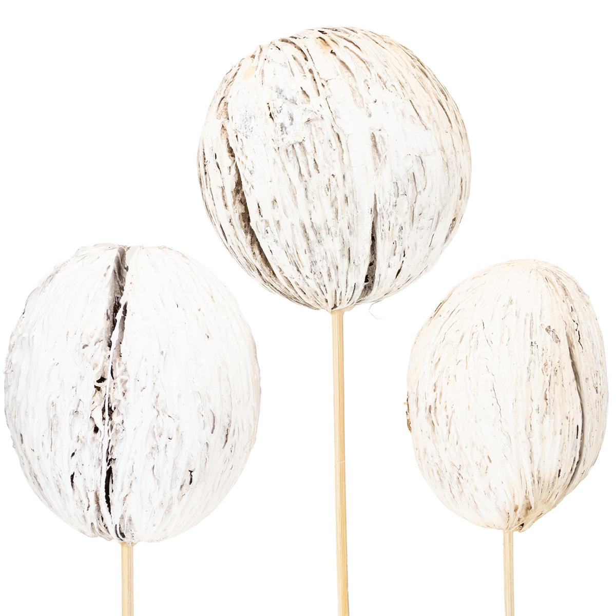 Koska pienet koristeelliset pallot on liimattu melko käytännöllisesti pitkiin puuvarsiin, on niitä entistä helpompi käyttää koristeellisesti: Laita ne yhdessä muiden eksoottisten luonnonmateriaalien, kuten Bull Cupin, Cane Cone ja Palmspear kanssa maljakkoon ja luo näin upea pöydän tai huoneen koriste. Lisäksi voit helposti kiinnittää puupallot tikkujen läpi multaan tai vaahtomuoviin, mikä helpottaa huomattavasti esimerkiksi kukkaruukkujen kaunistamista kotona tai koristeellisten hedelmien sisällyttämistä hautajaisjärjestelyihin. Voit myös poistaa varret ja asettaa Mintolla-pähkinät kulhoon tai kenties kuivattuun banaaninlehteen lipaston tai ikkunalaudan päälle. Näin luotu alkuperäinen katseenvangitsija vetää taatusti puoleensa kaikki katseet!
