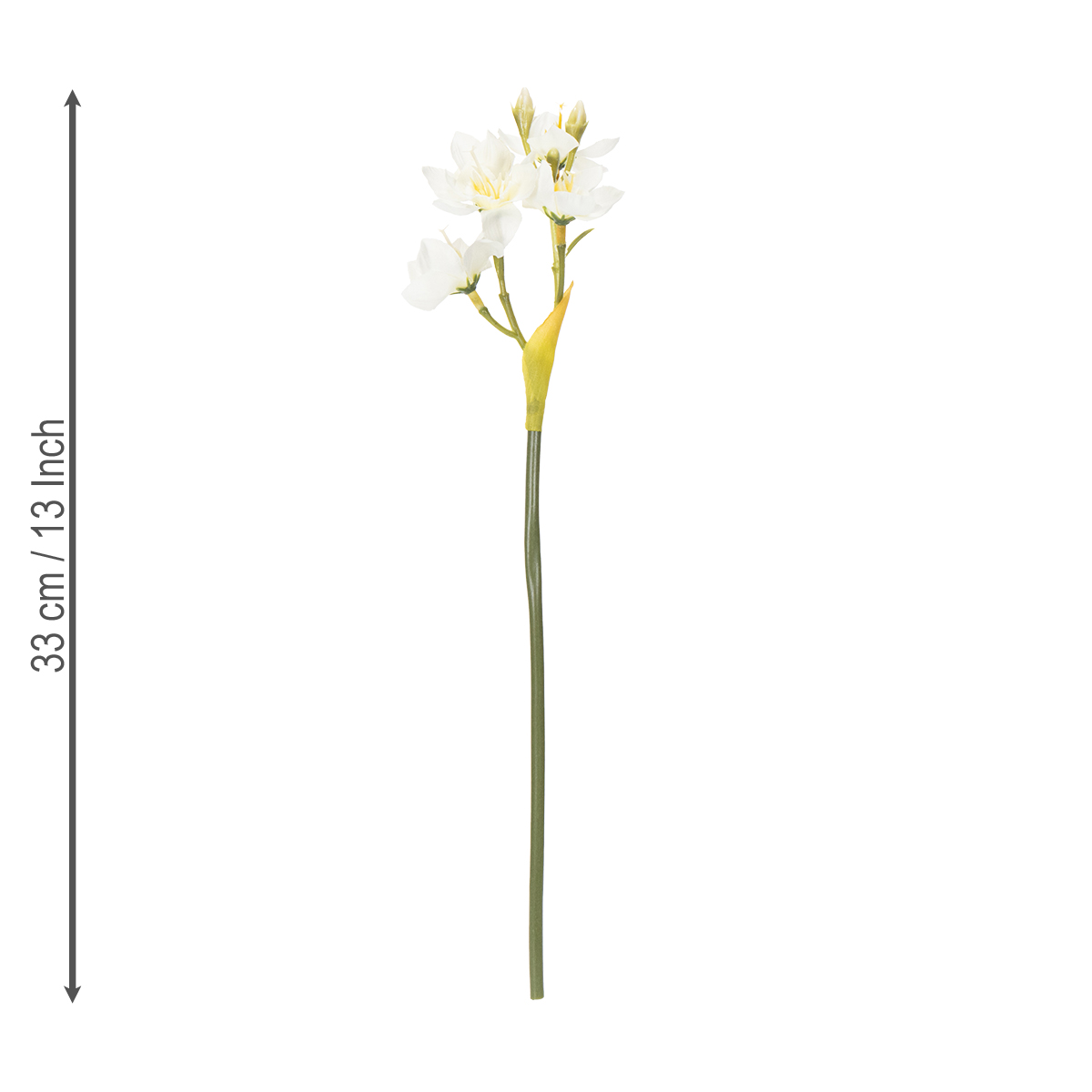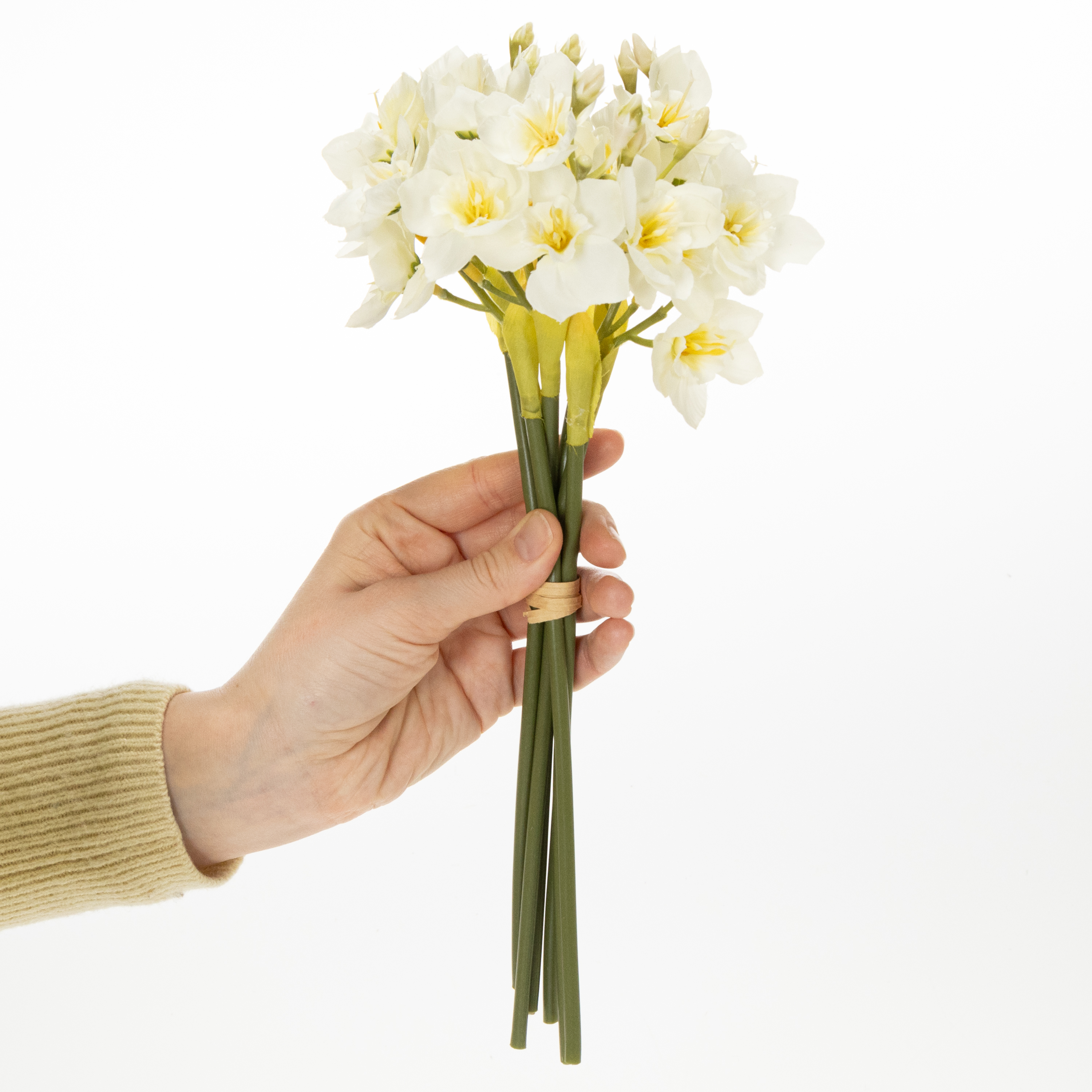 Täydellinen koriste hääjuhliin tai kausiluonteisiin kukka-asetuksiin: Narsissinoksamme yhdistää kauneuden ja käytännöllisyyden. Kuvittele, kuinka nämä taidokkaasti tehdyt valkoiset kukat täydentävät kattaustasi tai luovat romanttisen morsiuskimpun. Vieraasi ihastuvat! 33 cm pitkinä ja aidon näköisinä nämä tekonarsissit näyttävät siltä kuin ne olisi poimittu juuri – ja kaikki tämä ilman minkäänlaista hoitoa.