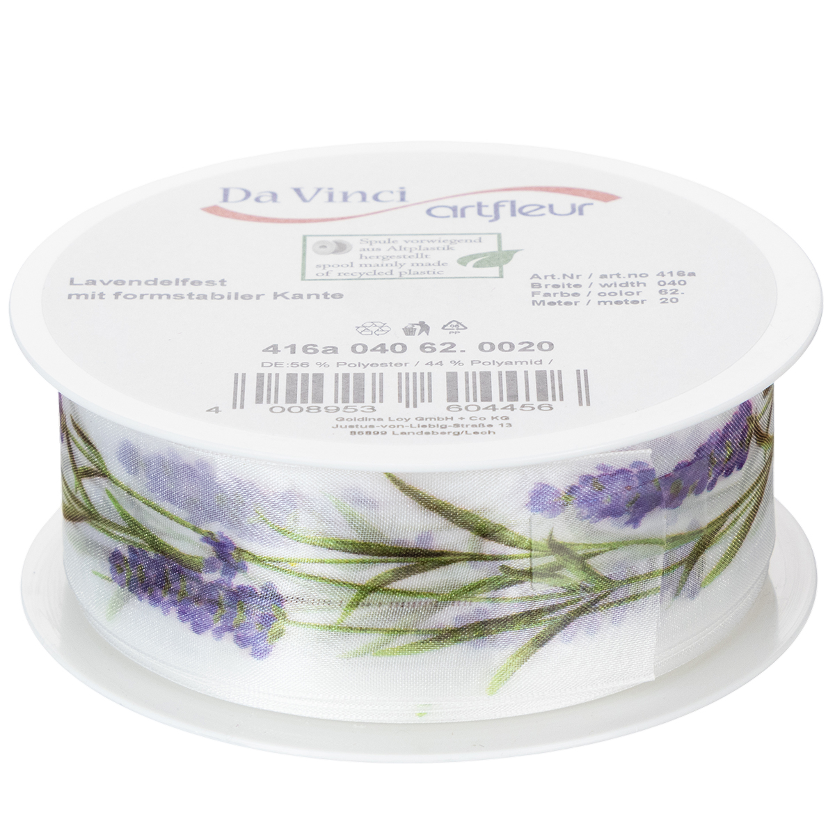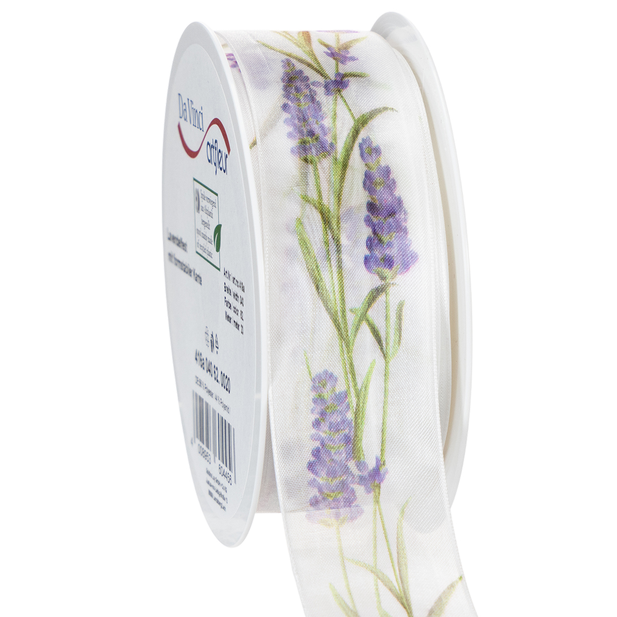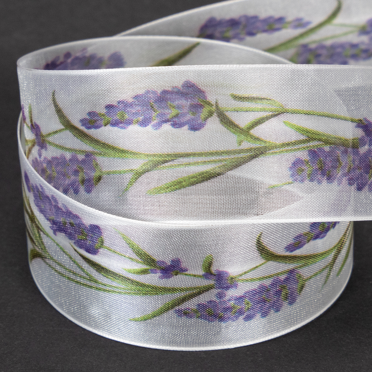 Laventeli-aihe näyttää raikkaalta ja värikkäältä organzanauhan valkoisella taustalla. Läpinäkyvällä organzakudoksella sifonkinauha on kevyt ja sille on ominaista kiilto, kun taas muotoa säilyttävät reunat varmistavat, että rusetit näyttävät viehättävältä.