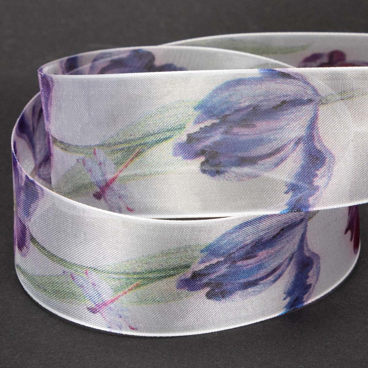 Perhoset, sudenkorennot ja vihreät lehdet kehystävät violetin papukaijatulppaanipiirroksia koristenauhassa. Läpinäkyvä organza-kangas antaa sifonkinauhalle ilmavan mutta kiiltävän ilmeen, kun taas mittavakaat reunat varmistavat, että rusetit pysyvät vakaina ja näyttävät optimaalisesti pakkauksissa ja seppeleissä.