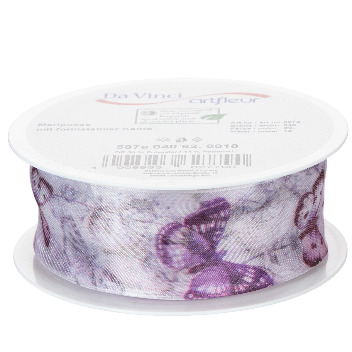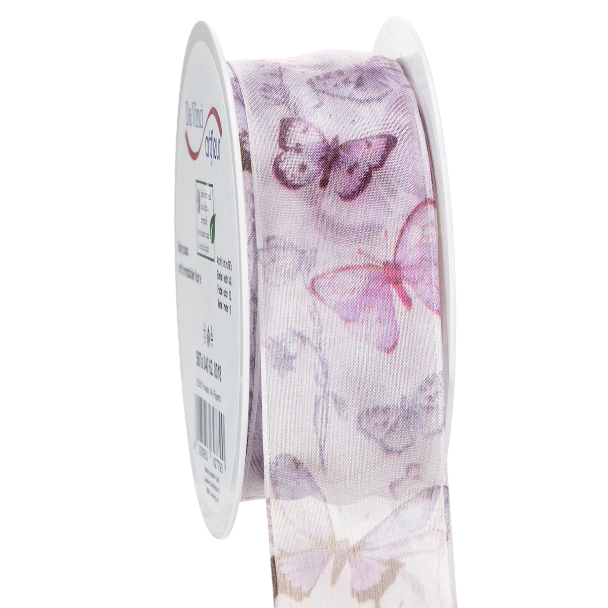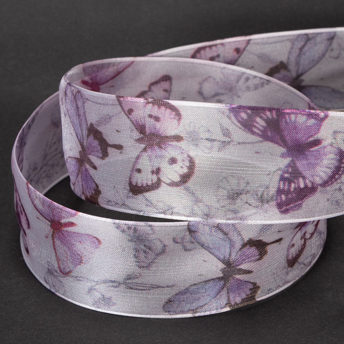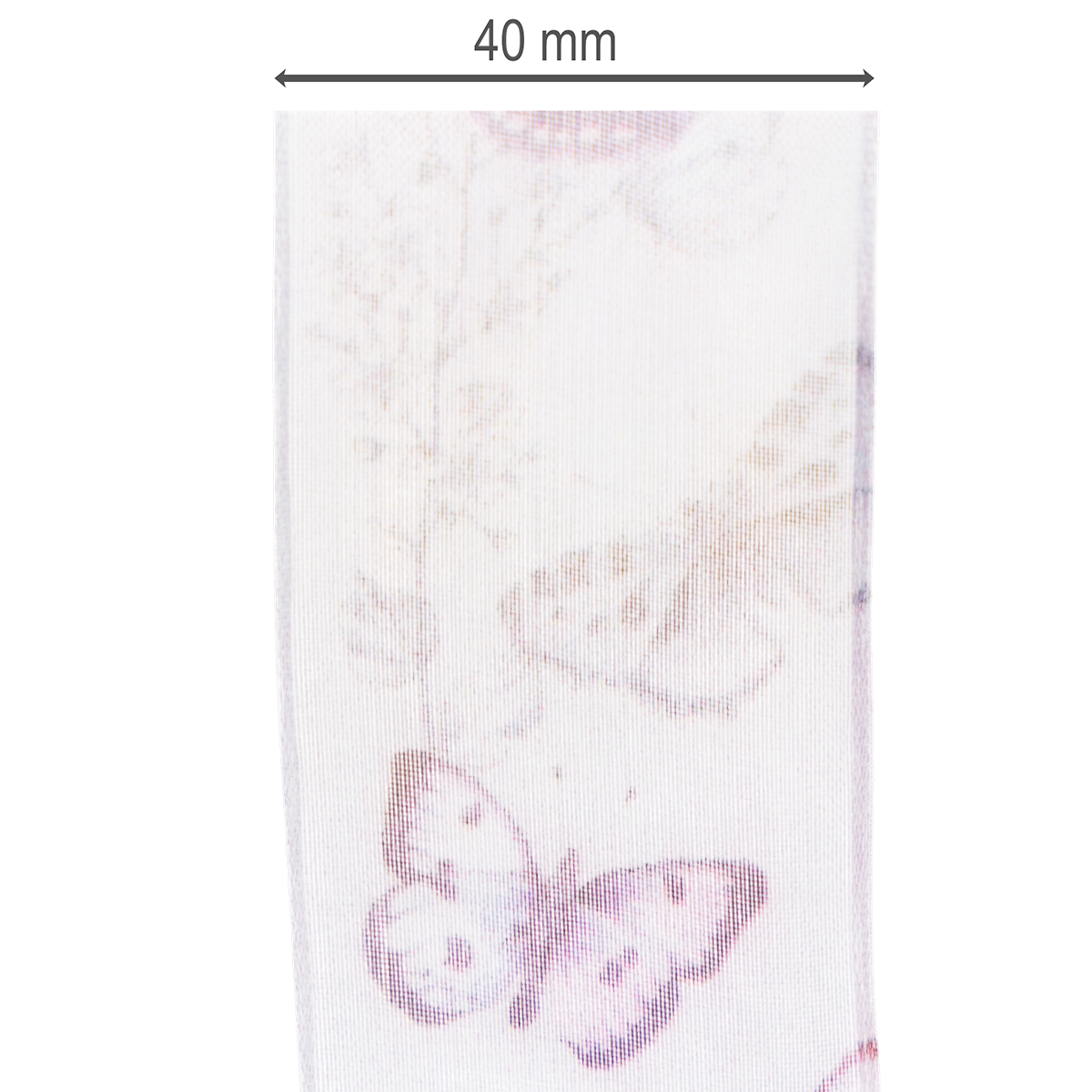 Yksityiskohtaisesti kuvatut perhoset kuuluvat erilaisiin, eksoottisiin ja erityisen kauniisiin lajeihin, mikä saa aiheen näyttämään erittäin hienostuneelta. Leveässä sifonkinauhassa on herkkä ja kevyt ulkonäkö läpinäkyvän organza-kankaan ansiosta, kun taas reuna varmistaa, että rusetit säilyttävät muotonsa.
