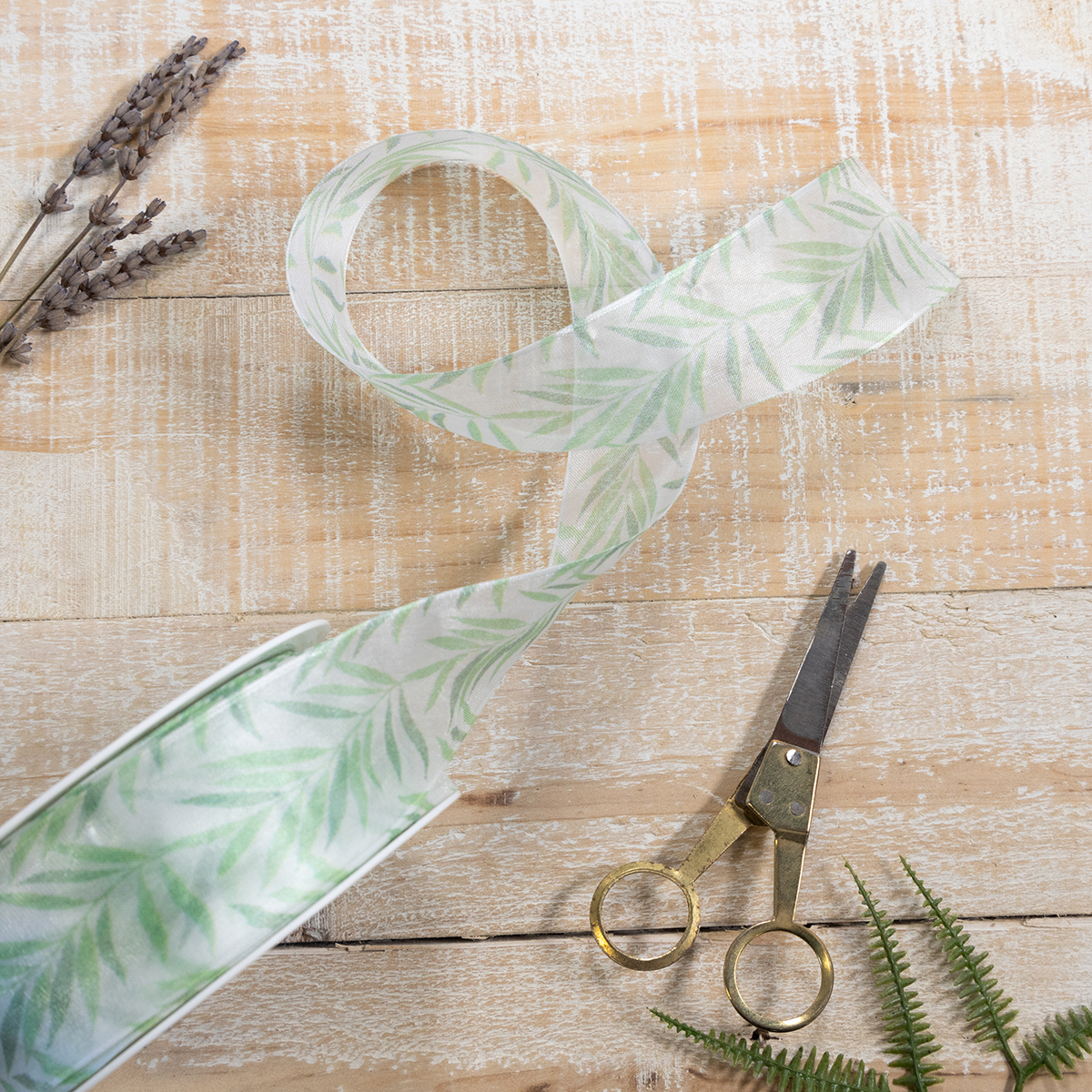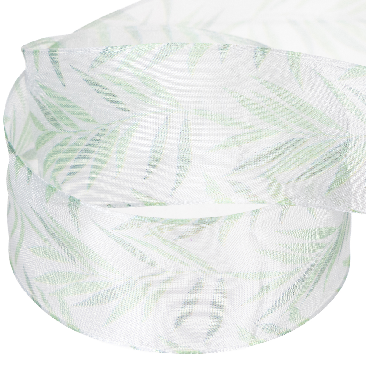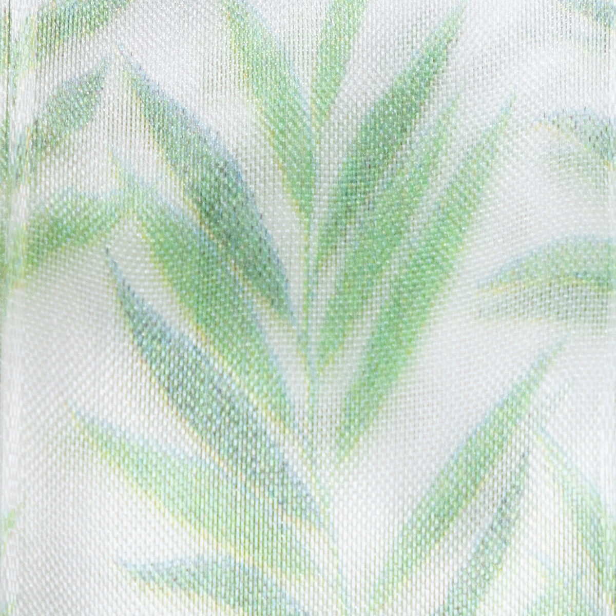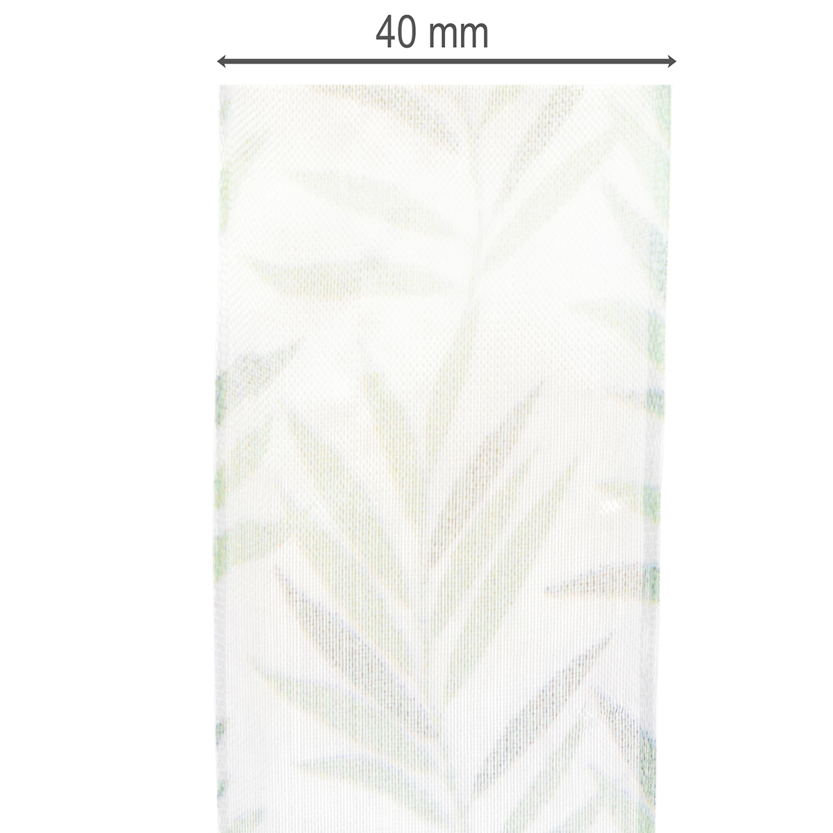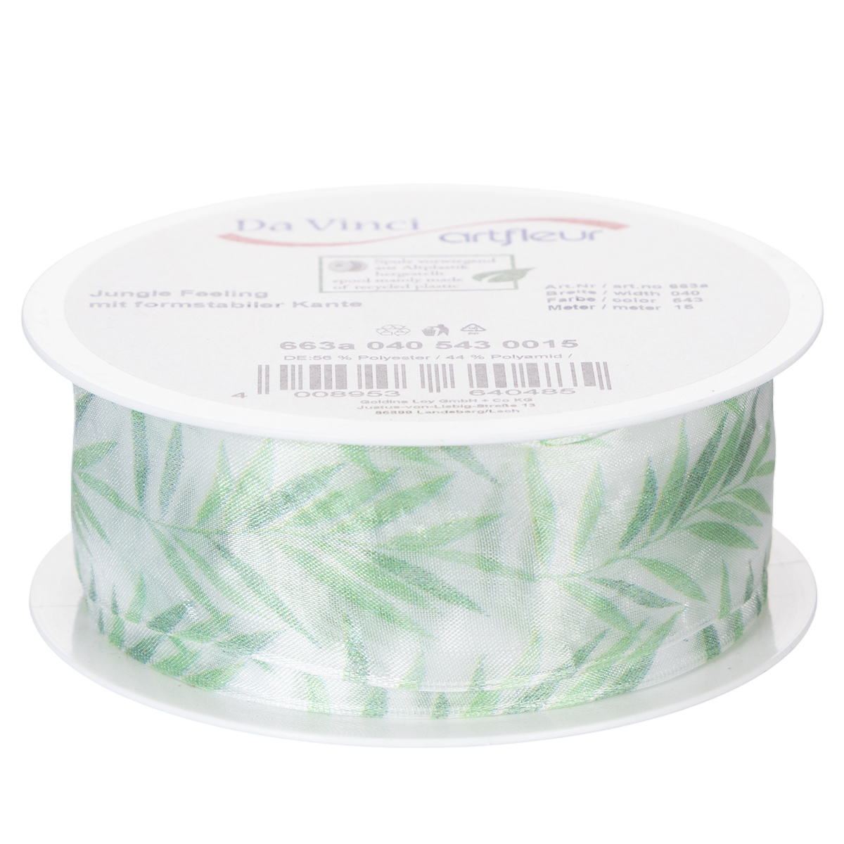 Vehreät, eksoottiset lehdet vihreän hienosävyisissä sävyissä luovat viidakon tunnelman valkoiseen, läpinäkyvään nauhaan. Läpinäkyvä organza-kangas antaa sifonkinauhalle kevyen ja herkän ulkonäön, kun taas mittavakaa reuna varmistaa, että rusetit pysyvät aina huippukunnossa.