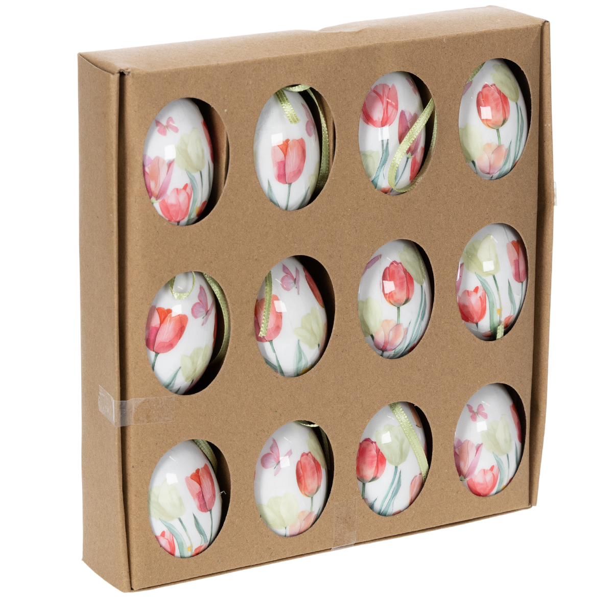 Kevät on aivan nurkan takana! Oletko jo miettinyt pääsiäiskoristeita? Entäpä jotain, joka on paitsi ajattoman kaunis, myös tuo ripauksen valoa mihin tahansa huoneeseen tai pääsiäispuuhun? Pääsiäismunakoristeet lumoavine tulppaaniaiheineen ovat juuri sitä, mitä tarvitset. Mukana tulevan nauhan avulla munat on helppo ripustaa oksiin, ikkunoihin tai jopa pääsiäiskoriin. Haluatko yllättää vieraasi tyylikkäästi koristellulla pöydällä? Nämä koristeelliset pääsiäismunat ilahduttavat varmasti kevään ystäviä. Herkkien tulppaaniaiheiden lämmin hehku yhdistettynä klassiseen valkoiseen pohjaan sopii täydellisesti maalaistyyliseen sisustukseen, mutta se sulautuu kauniisti myös moderneihin ja minimalistisiin sisustuksiin. Tule itse kokemaan ja tuo kevät kotiisi näillä tyylikkäillä koristeilla!