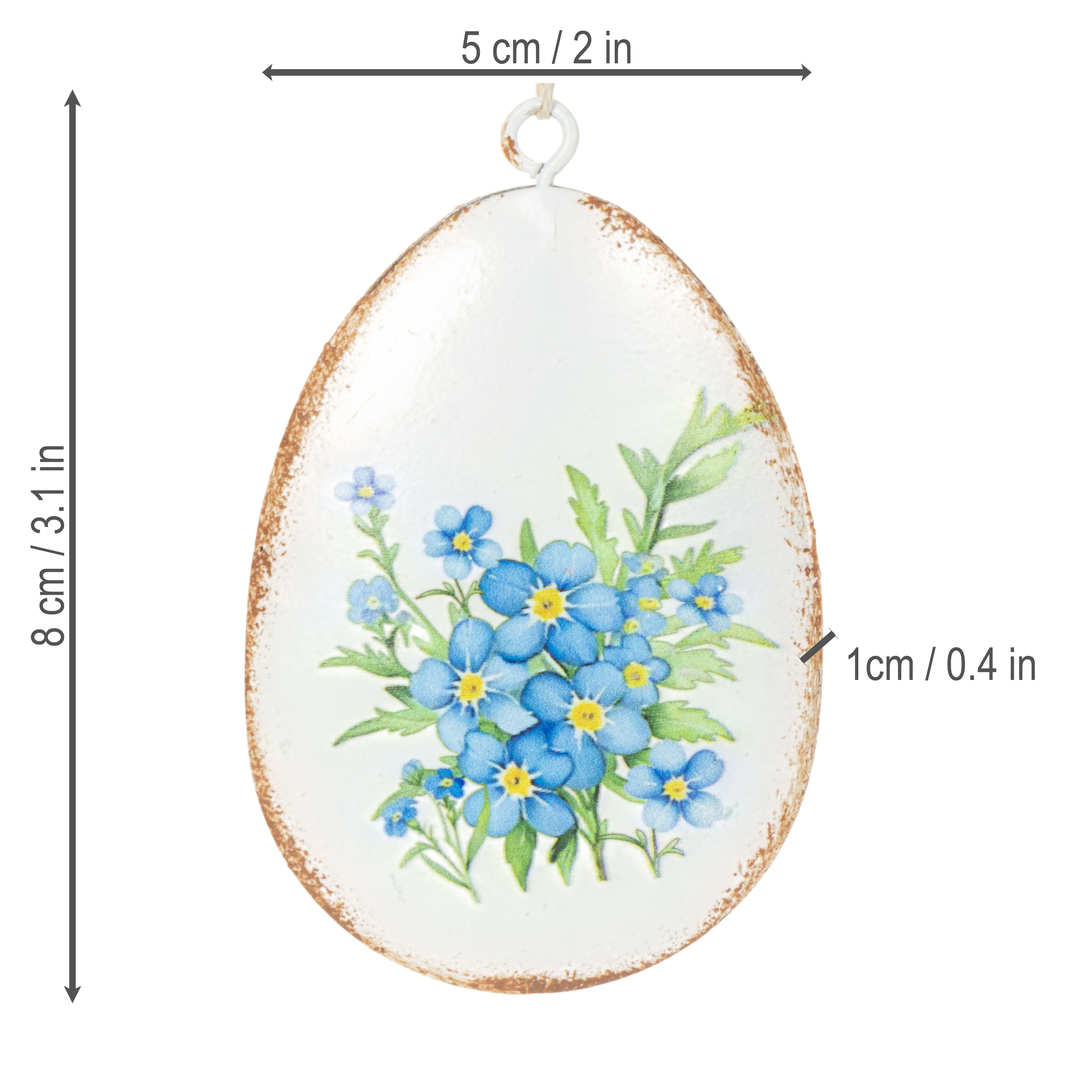 Nämä koristeelliset metalliset pääsiäismunat tekevät vaikutuksen kooltaan ja ulkonäöltään. Ne ovat 8 cm korkeita ja 5 cm halkaisijaltaan täydellisiä moniin käyttötarkoituksiin. Hieman mattavalkoista pohjaa täydentävät neljä erilaista kukka-aihetta, jotka tuovat kevään eloon: herkistä unohda-kukista värikkäisiin narsisseihin. Niiden hienovarainen vintage-ilme tekee niistä erityisen tyylikkäitä ja sopivat täydellisesti retro-, shabby chic- tai maalaistyyliin.