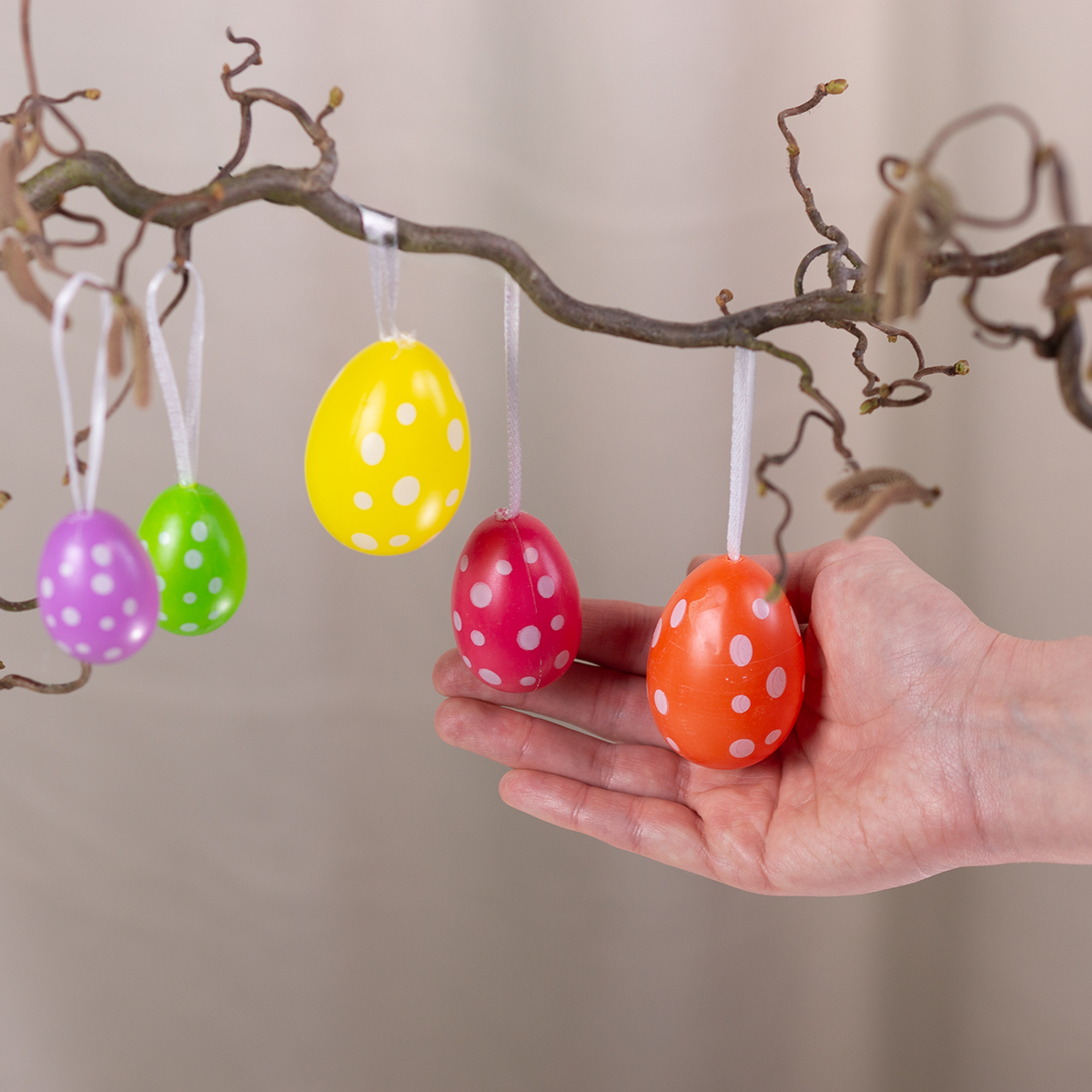 Nämä värikkäät roikkuvat pääsiäismunat ovat täydellinen lisä pääsiäiskoristeisiin. Setti sisältää 12 kestävästä muovista valmistettua munaa, joten lasten on helppo ripustaa ne. Värit keltainen, sininen, vihreä, oranssi, pinkki ja violetti sekä valkoiset pilkut luovat eloisan ja leikkisän ilmeen. Suuri muna on noin 6 cm korkea – ihanteellinen koko ripustettavaksi oksiin, kukka-asetelmiin tai pääsiäispuuhun.