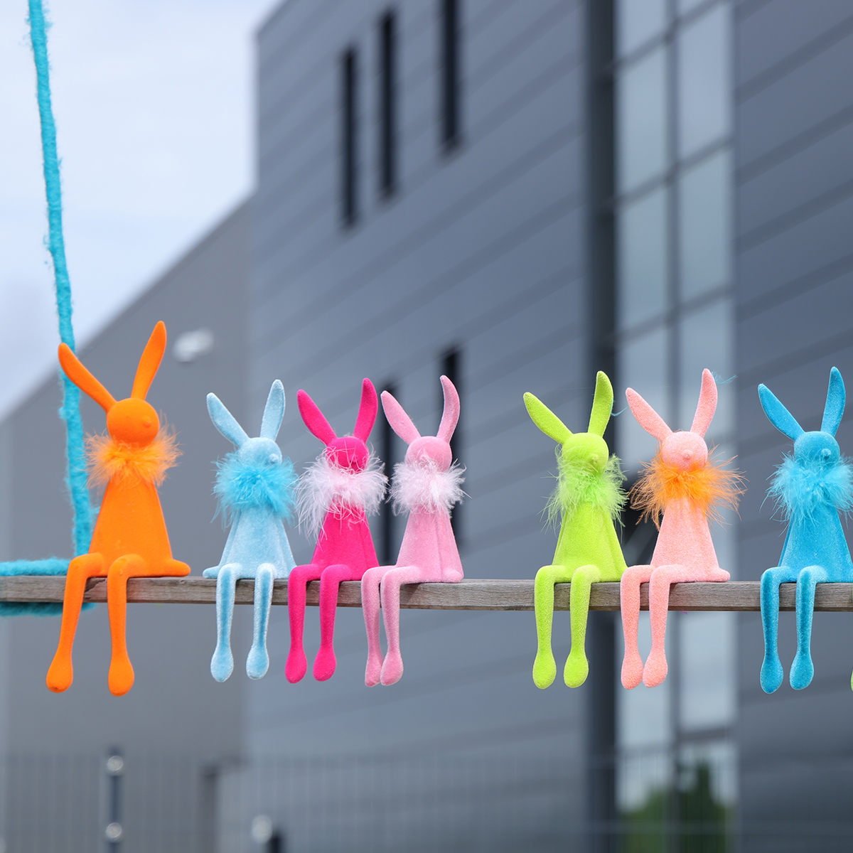 Nämä pääsiäispupuhahmot lumoavat omaperäisellä mutta modernilla muotoilullaan. 27 cm korkeat hahmot tekevät vaikutuksen harmonisilla muodoillaan ja poikkeuksellisella materiaalillaan. Samettinen, lohenpunainen ja eloisan oranssi muovi on paitsi visuaalisesti upea, myös miellyttävä koskettaa. Pieni, aidoista höyhenistä valmistettu höyhenboa antaa pupuille erityisen silauksen. Käytettiinpä sitä sitten pöytäkoristeena olohuoneessa, ikkunalaudalla tai leikkisänä asusteena eteisessä – mahdollisuudet ovat lähes rajattomat.