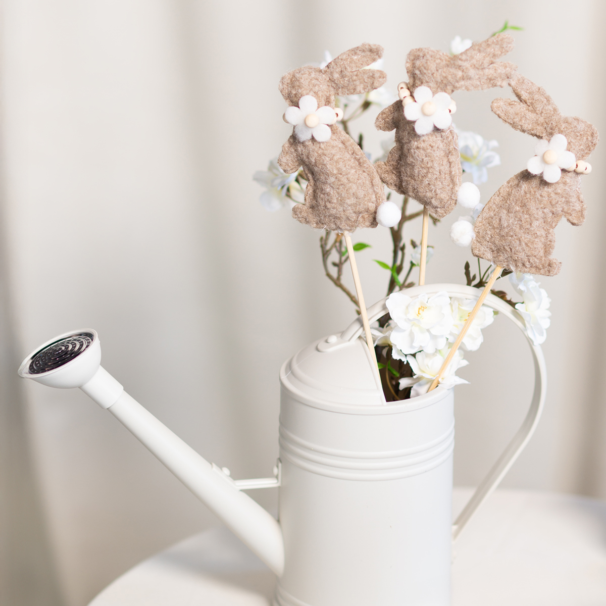 Tämä pääsiäispupukoriste on todellinen kohokohta luoville sisustusharrastajille. Hahmot on valmistettu korkealaatuisesta huovasta, jonka lämpimän ruskea sävy huokuu luonnollisuutta ja kodikkuutta. Viehättävät yksityiskohdat, kuten herkkä kukka ja pieni pörröinen häntä, antavat pupuille erityisen viehätyksen. Tukevan varren ansiosta pupujen asetteleminen maljakoihin, ruukkuihin tai kukka-asetelmiin on helppoa. Minimalistisesta tai skandinaavisesta tyylistä pitäville ihastuu näiden hahmojen hillitty mutta ilmeikäs tyyli.