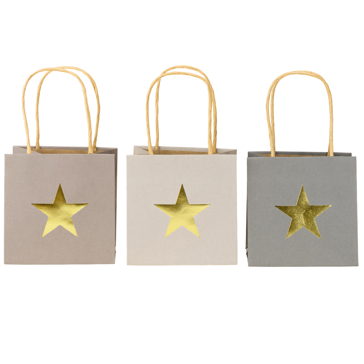 Saat kolme paperipussia, joissa kussakin on tähti kolmessa eri harmaan sävyssä. Neliönmuotoiset lahjakassit ovat saatavilla tässä versiossa erikseen isompana myymälästämme.