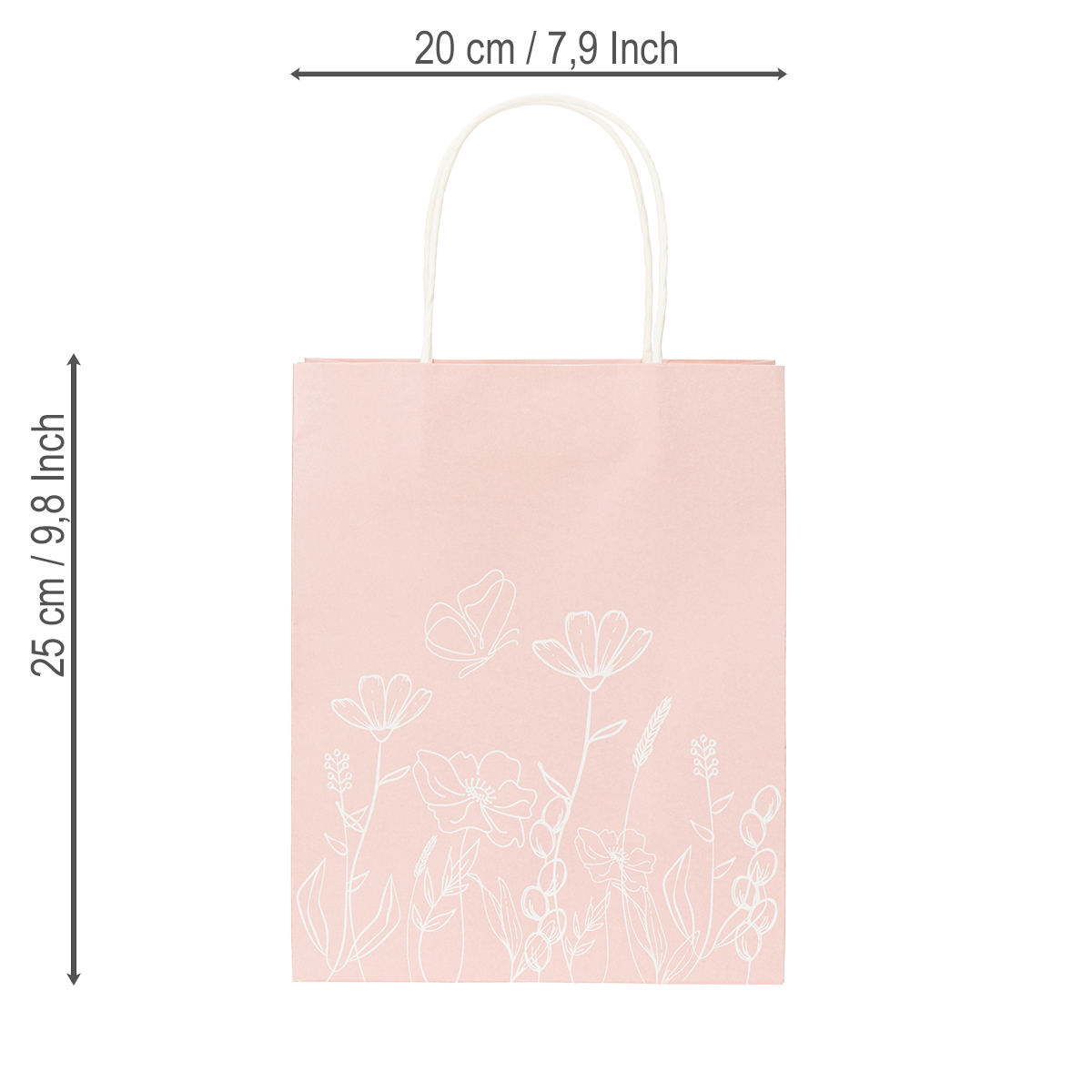 Kassien hienovaraisesti painettu kukkakuvio on erityisen huomionarvoinen. Se antaa kasseille ripauksen eleganssia ja raikkautta – täydellisiä kevään juhliin, kesän syntymäpäiville tai romanttisiin tilaisuuksiin. Myös kestävää kehitystä arvostavat tekevät vaikutuksen: kassit on valmistettu paperista, mikä tekee niistä ympäristöystävällisen vaihtoehdon muovipakkauksille. Käytännölliset kantokahvat tekevät niistä helppokäyttöisiä ja varmistavat pakatun yllätyksen tyylikkään kuljetuksen.