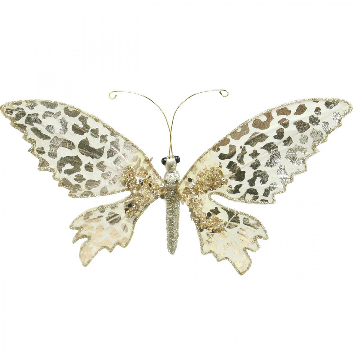 Perhosen runko on tukevaa polyresiiniä, siivet ovat kermanväristä paperia, johon on painettu kultainen leopardikuvio. Kauniin hyönteisen vartalo ja siipien reunat on päällystetty kultaisella glitterillä, ja siivet on lisäksi koristeltu lasihelmillä ja glitterkivillä tyvessä.