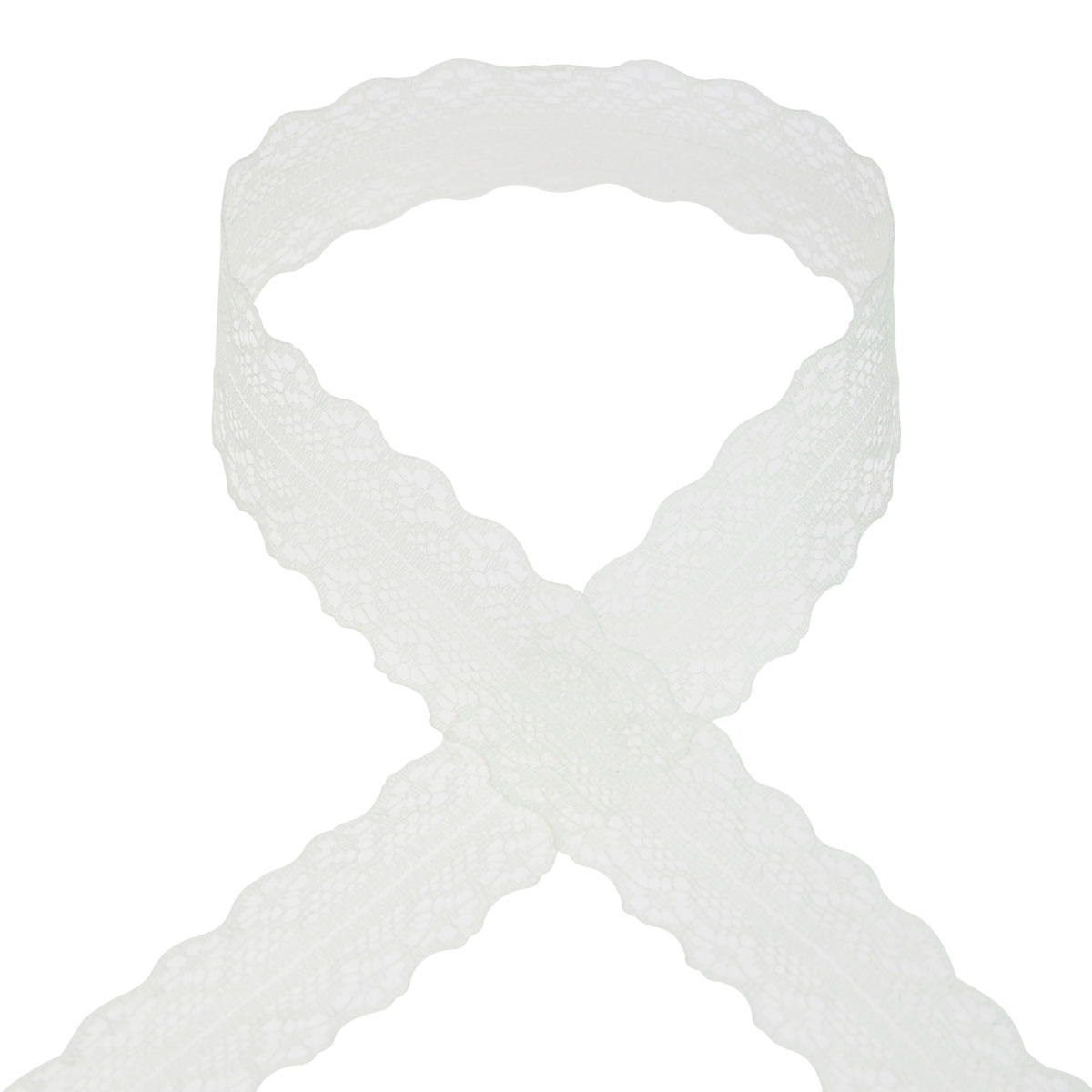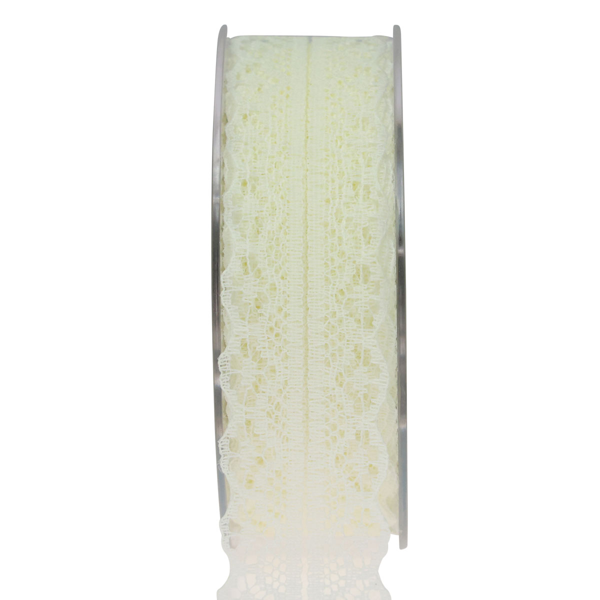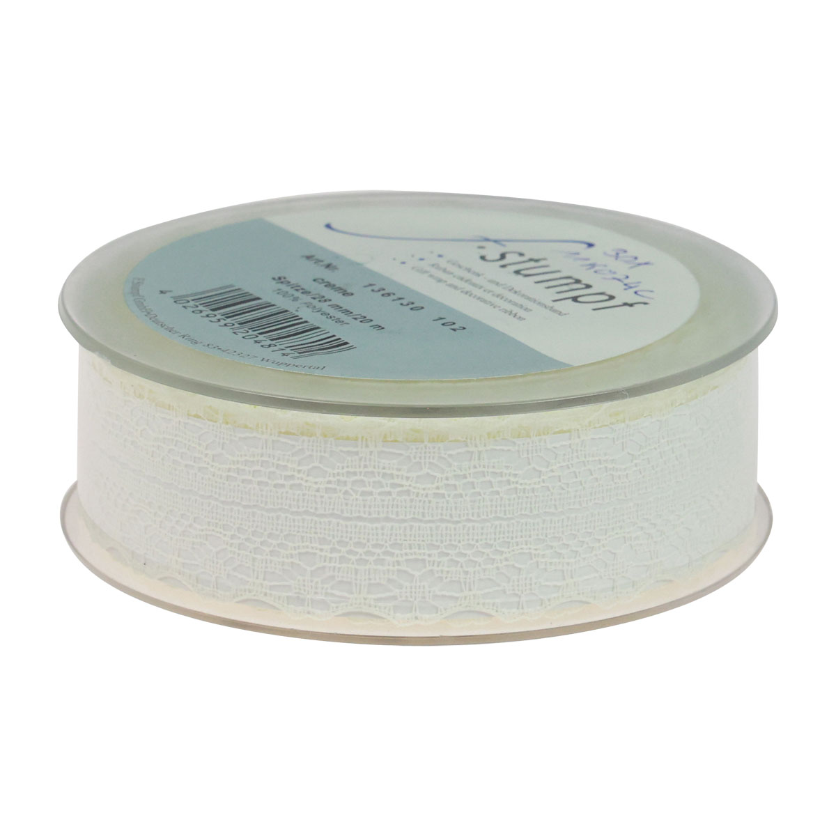 Herkkä pitsinauha on noin 28 millimetriä leveä ja 20 metriä pitkä. Koristenauha tulee käytännölliseen muovikelaan, joka helpottaa mittaamista ja leikkaamista.