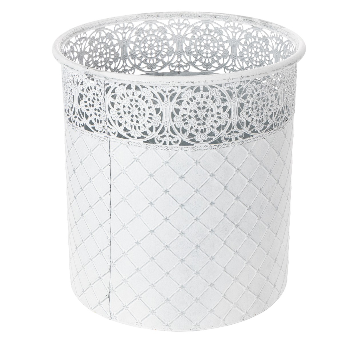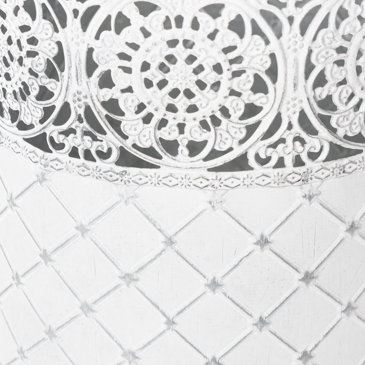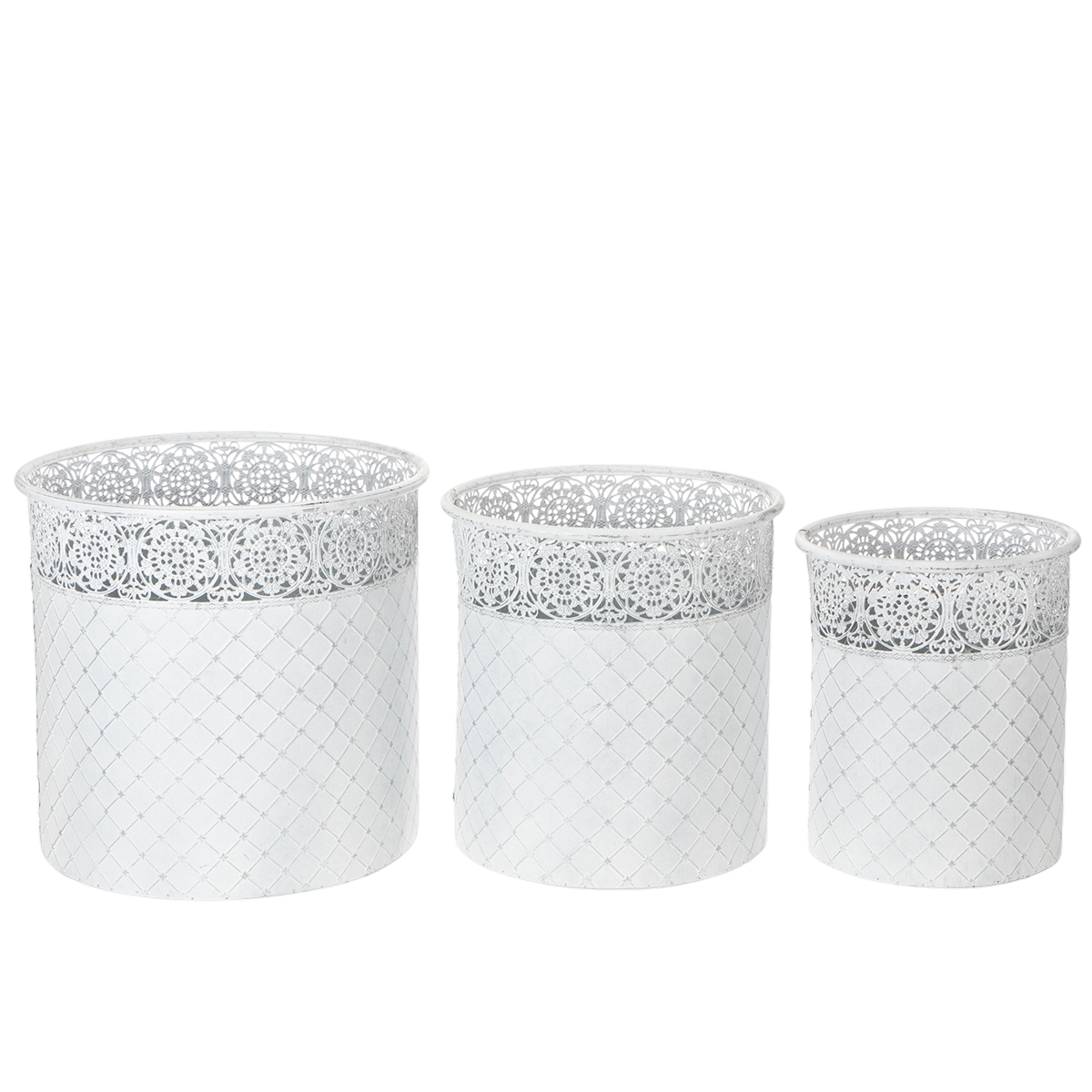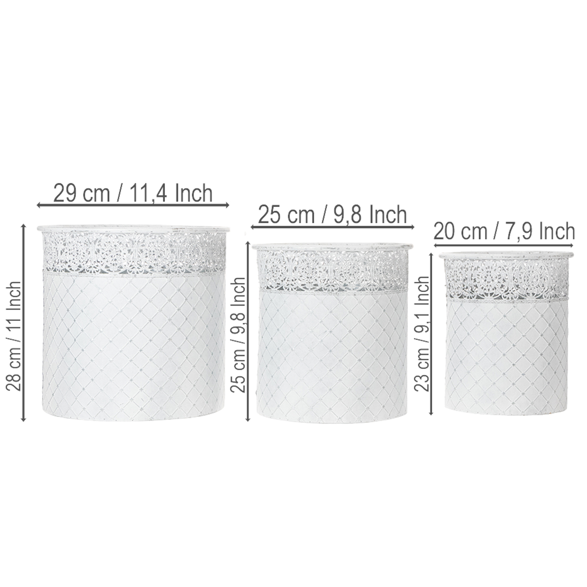 Pitsikuvioinen ruukku, metalliastia, koristeämpäri, valkoinen, hopea, shabby chic, korkeus 28/25,5/23,5 cm, halkaisija 29,5/25,5/20 cm, 3 kpl setti