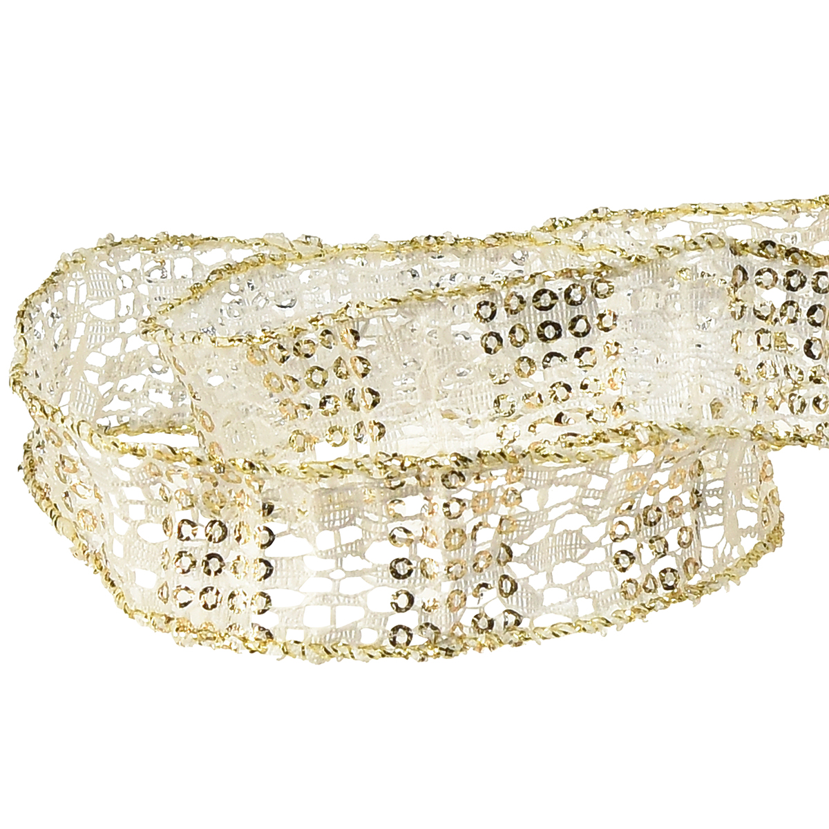Tervetuloa eleganttien pöytäkoristeiden tai lumoavien lahjapaketointien viehätysvoimaan valkoisen ja kullan värisellä pitsinauhallamme. Tämä upea asuste ei ole vain ihanteellinen hääkoristeisiin, vaan se on myös katseenvangitsija moniin muihin juhlatilaisuuksiin ja luoviin askarteluideoihin.