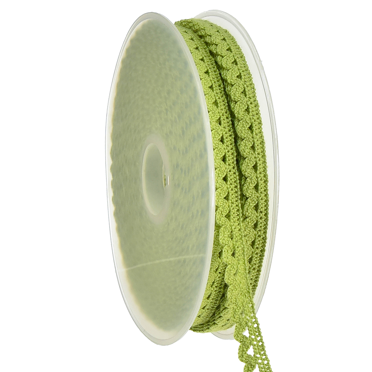 Vihreä koristenauha, jossa on virkattu pitsi, on noin 9 millimetriä leveä ja noin 20 metriä pitkä. Saat koristenauhan rullana litteällä muovikelalla, johon se kiinnitetään ohuella, hopeanvärisellä neulalla.