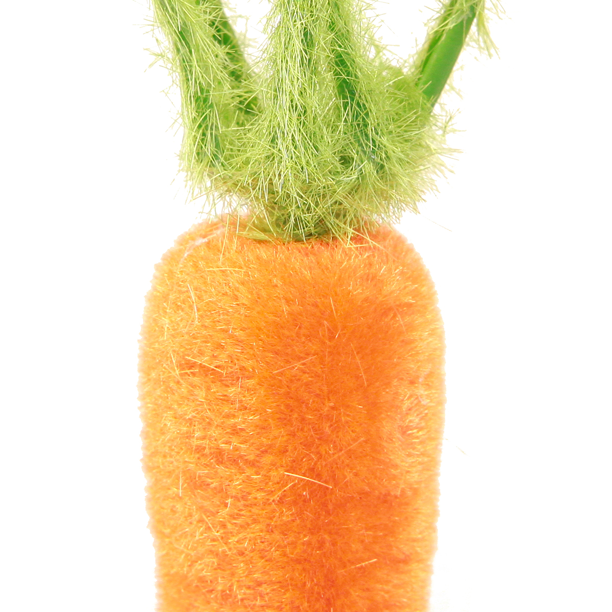 Porkkanakoriste on valmistettu korkealaatuisesta muovista, joka on vaikuttava kestävyydeltään. Flokoitu pinta antaa porkkanoihin ja tyypilliseen porkkananvihreään erityisen tunteen. Flocking saa myös keinoporkkanan hohtamaan hieman, mikä tekee siitä katseenvangitsijan pöytäkoristeeseesi.