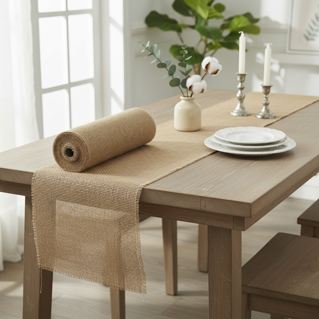 Pöytäjuoksijana luonnossa oleva juuttinauha on kääritty rullalle, ja se on helppo rullata kokoon. Juutista valmistetun koristenauhan pituus on noin 10 metriä ja leveys noin 30 senttimetriä.