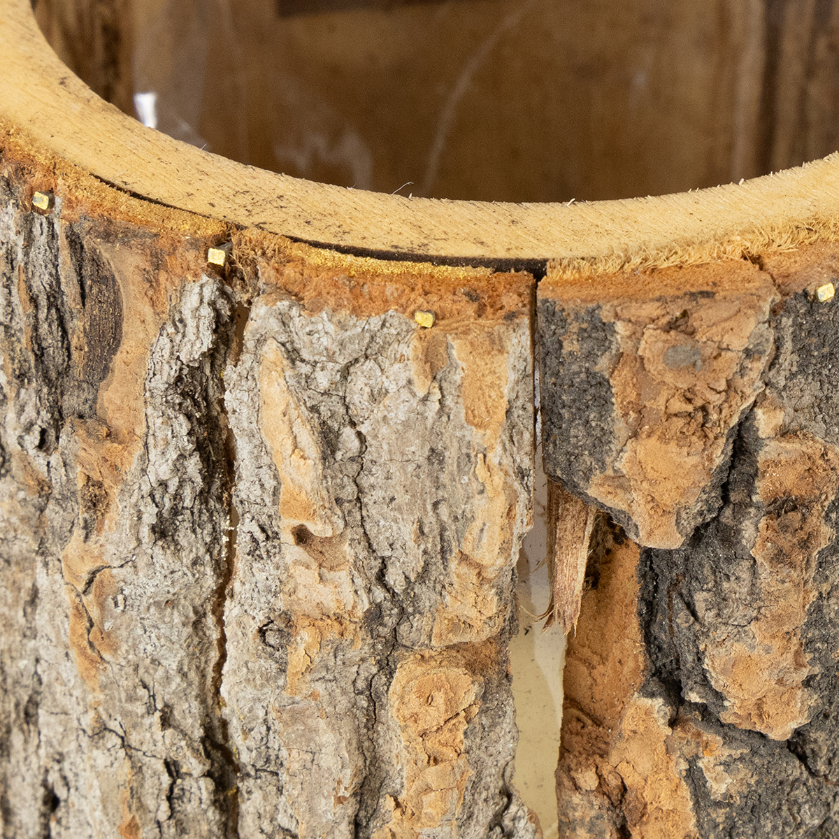 Pyöreä ruukku koostuu yhdistelmäpuunkuoresta, mikä antaa sille epätavallisen ilmeen.
