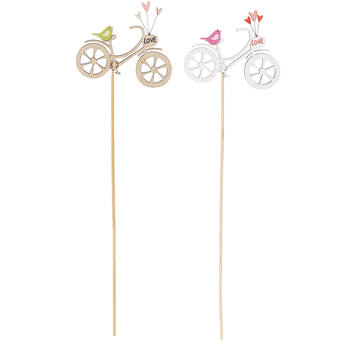 Nämä 29,5 cm pitkät puiset polkupyöräaiheiset kepit luovat silmiinpistävän mutta hillityn katseenvangitsijan. Sirot, pienillä sydämillä ja siroilla linnuilla koristellut polkupyörät säteilevät puhdasta kevään iloa. Luonnonpuu näyttää harmoniselta ja sopii lähes mihin tahansa sisustustyyliin – olipa se sitten skandinaavinen, maalaisromanttinen tai shabby chic. Ihana katseenvangitsija terassilla, puutarhassa tai jopa koristeena sisätiloissa.