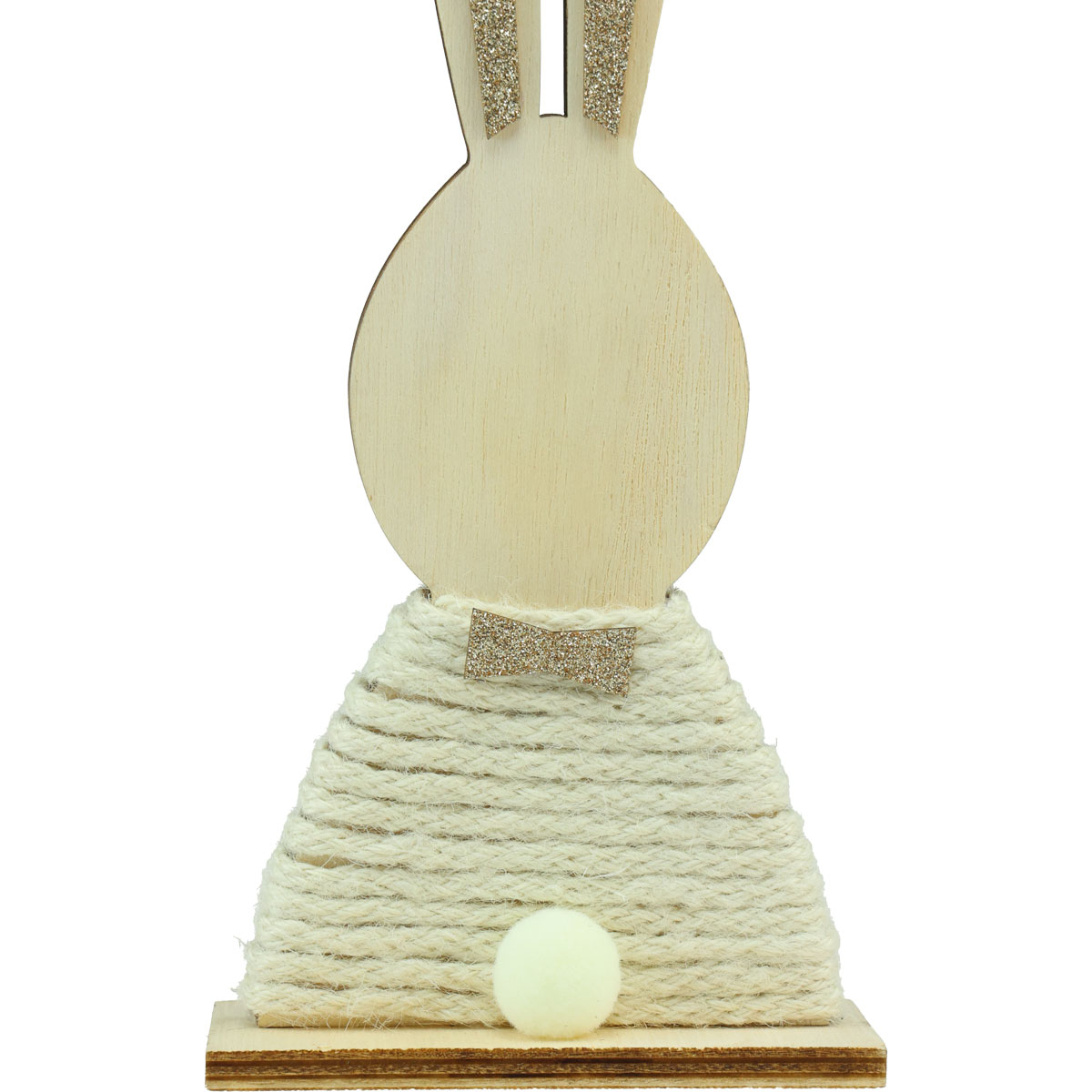 Kanihahmot koostuvat puusta huolellisesti jyrsitystä siluetista. Vartalo on kääritty luonnonkuidulla, mikä antaa koristeellisille kaneille heidän erityisen boho-tyylinsä. Rusetin ja kimaltelevien korvien kanssa puinen pääsiäispupu näyttää erittäin tyylikkäältä. Pörröinen häntä viimeistelee pääsiäishahmon söpöllä tavalla. Puisen jalustan ansiosta teline seisoo luotettavasti pöydällä tai ikkunalaudalla tai piilota jalusta pääsiäisruohon alle pesään!