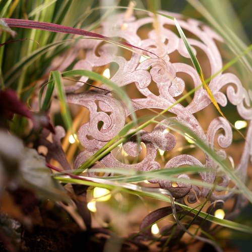 Luo unenomainen-romanttinen puutarhakoriste tällä ruosteenvärisellä, valkoiseksi pestyllä metallipallolla: jalon VIANA-merkin koristeellisista metallikoristeista koostuva pallo on todella jotain erityistä! Ripusta filigraaninen metallikoriste esimerkiksi terassille tai parvekkeelle tai luo tyylikäs katseenvangitsija sijoittamalla se kivikkopuutarhaan tai kukkapenkkiin.Tuulen ja sään vaikutuksesta koristepalloon voi lisäksi muodostua aitoa ruostetta, mutta se ei vähennä sen kauneutta: Käytettynä sekä kesällä kiipeilyyn että talvella herkällä valonjohdolla koristeltuna se on jalo koriste-elementti! Näin valmistettua, trendikkään ruosteen näköistä palloa voidaan käyttää esimerkiksi pöydän koristeena tai katseenvangitsijana näyteikkunassa istutusastiassa. Todella ehdoton kohokohta mihin aikaan vuodesta tahansa!