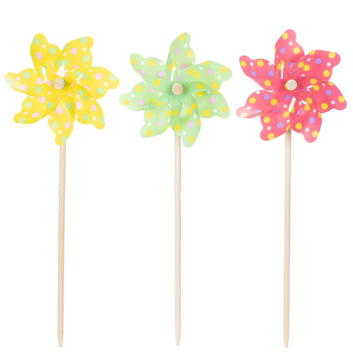 Kokonaiskorkeudeltaan 47 cm ja halkaisijaltaan 17 cm nämä tuulimyllyt sopivat täydellisesti sijoitettavaksi kukkien ja kasvien joukkoon. Kestävä muovimateriaali yhdistettynä tukevaan puuvarteen takaa kestävyyden. Ja mikä parasta: saat kolmen tuulimyllyn sarjan, joten voit päästää luovuutesi valloilleen.