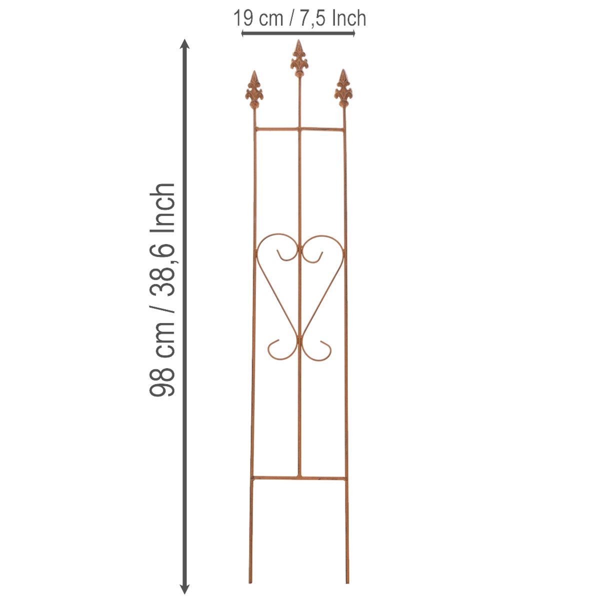 Lisää puutarhaasi ripaus viehätystä koristeellisella sydämenmuotoisella puutarhasäleiköllämme! Kuvittele köynnösruusuja, murattia tai muita köynnöskasveja elegantisti kiipeilemässä tätä herkästi valmistettua metallisäleikköä pitkin. Lumoava, sään kuluttama metallipinta ja sydämen muoto tekevät tästä kappaleesta todellisen katseenvangitsijan, olipa se sitten puutarhapolun varrella, kukkapenkin keskellä tai parvekkeellasi korostuksena. Korkealaatuisesta ja kestävästä metallista valmistettu se sopii erinomaisesti suojaisille ulkoalueille ja tarjoaa vakaan tuen köynnöksille. 98 senttimetriä korkea ja 19 senttimetriä leveä se sopii täydellisesti ruukkuihin, suurempiin kukkapenkkeihin tai talon seinien viereen.