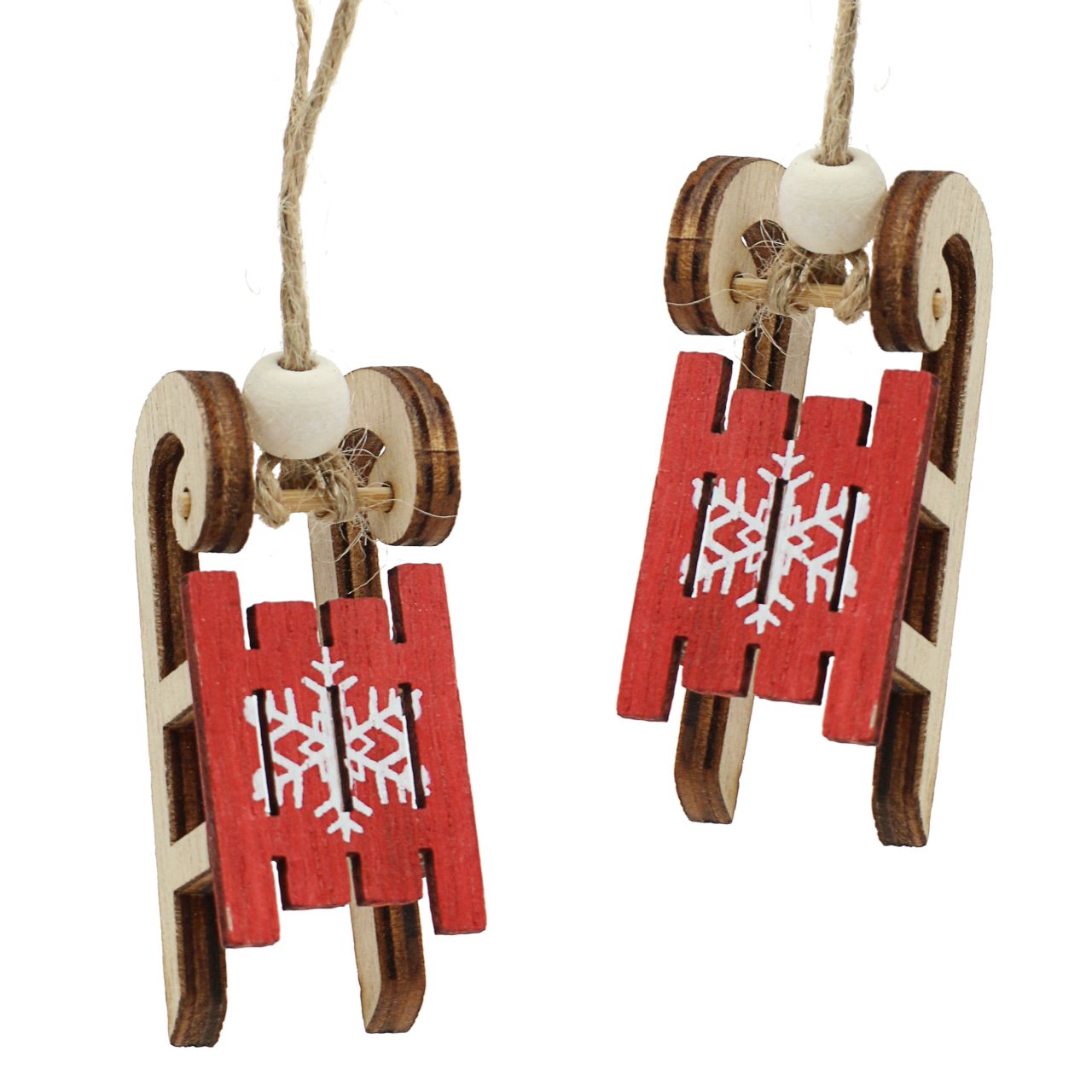 Punaiset kelkat saat ripustettavaksi käytännöllisessä 12 kappaleen setissä, joka on valmistettu kokonaan puusta ja raffiasta. Niiden pituus on noin 6 senttimetriä, ja pituus narujen kanssa on noin 14 senttimetriä. Korkeus ja leveys ovat kumpikin noin 2,5 senttimetriä.