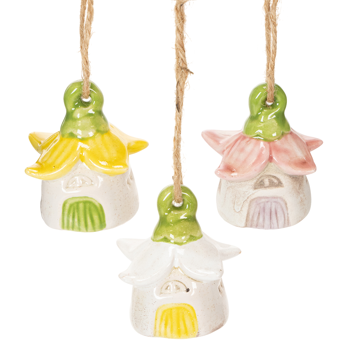 Entäpä satumainen katseenvangitsija, joka ilahduttaa sekä lapsia että aikuisia? Tämä ihastuttava riippuva koriste minikeraamisen keijumalon muodossa muuttaa minkä tahansa tilan taianomaiseksi paikaksi. Olipa se sitten puutarhassasi, parvekkeellasi tai ehkä olohuoneessa, nämä pienet, yksityiskohtaiset kukkatalot herättävät välittömästi huomiota! Kauniiden väriaksenttien ja 6 senttimetrin koon ansiosta nämä koriste-esineet sopivat täydellisesti leikkisän tunnelman luomiseen. Ne leikittelevät herkillä keltaisen, vaaleanpunaisen ja valkoisen sävyillä, mikä tekee niistä sekä hillittyjä että lumoavia. Voit asetella ne yksittäin tai käytännöllisessä kuuden kappaleen sarjassa, mikä tekee suunnittelumahdollisuuksista käytännössä rajattomat.