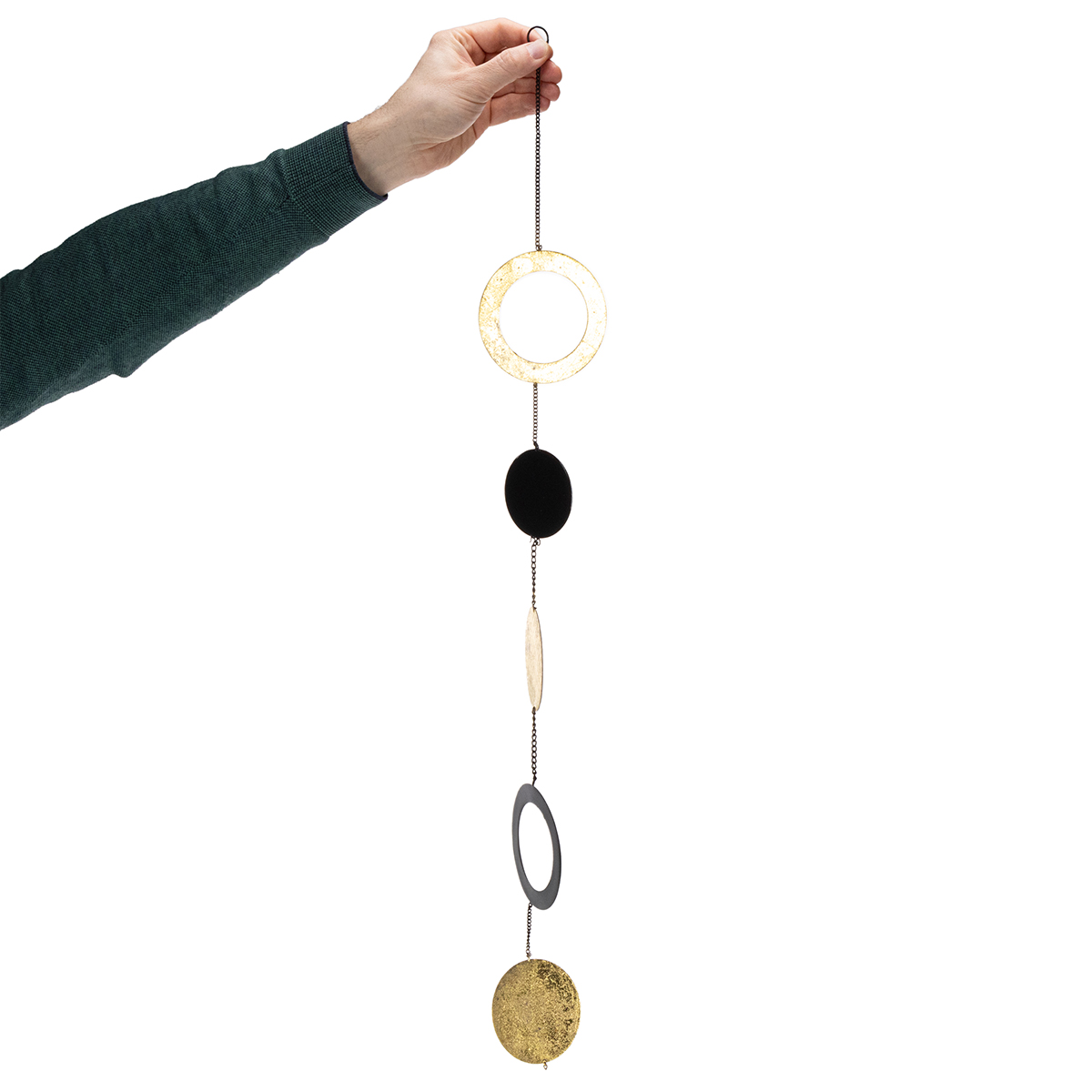 Tässä koristeessa on viisi erikokoista pyöreää elementtiä, jotka on suunniteltu kiekoiksi ja renkaiksi ja jotka vuorottelevat mustan ja kullan värisinä. Pyöreät riippuvat koristeet on yhdistetty ohuilla metalliketjuilla, ja jokaisessa on yläosassa pieni rengas ripustamista varten.