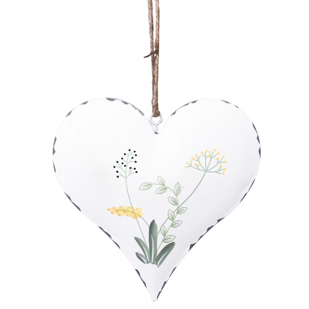 Voit ripustaa kukkakuvioidut valkoiset metallisydämet luonnonkuitunauhaan, joka on jo kiinnitetty. Tämä komponentti sekä keinotekoiset hankausjäljet, jotka löydät reunoista, korostavat myös tämän vintage-koristeen nostalgista viehätystä.