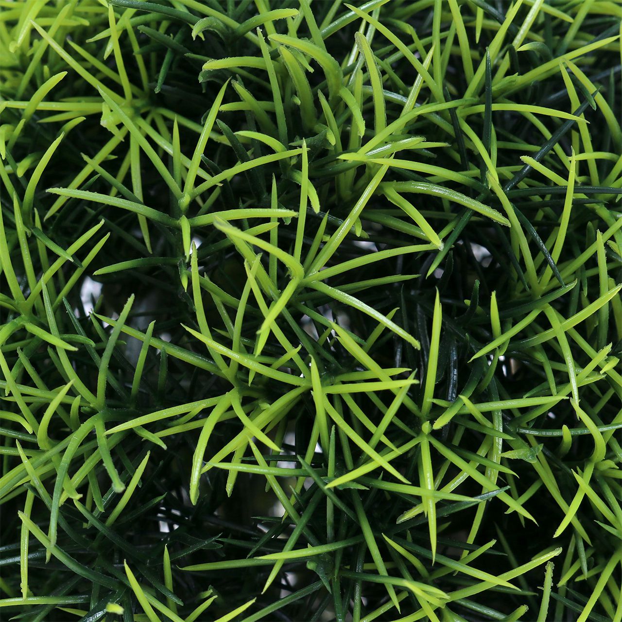 Vihreän ruohopallon halkaisija on noin 18 senttimetriä ja se koostuu ruudukkopallosta, johon on kiinnitetty suuri määrä pieniä tekonurmituppeja. Tummanvihreän pohjan ja vaaleanvihreiden kärkien ansiosta nurmikkopallo näyttää erittäin kolmiulotteiselta ja eloisalta. Tämä tarkoittaa, että voit luoda terveellisen ja iloisen tunnelman huoneeseesi pienin askelin ja tällä ruohopallolla.