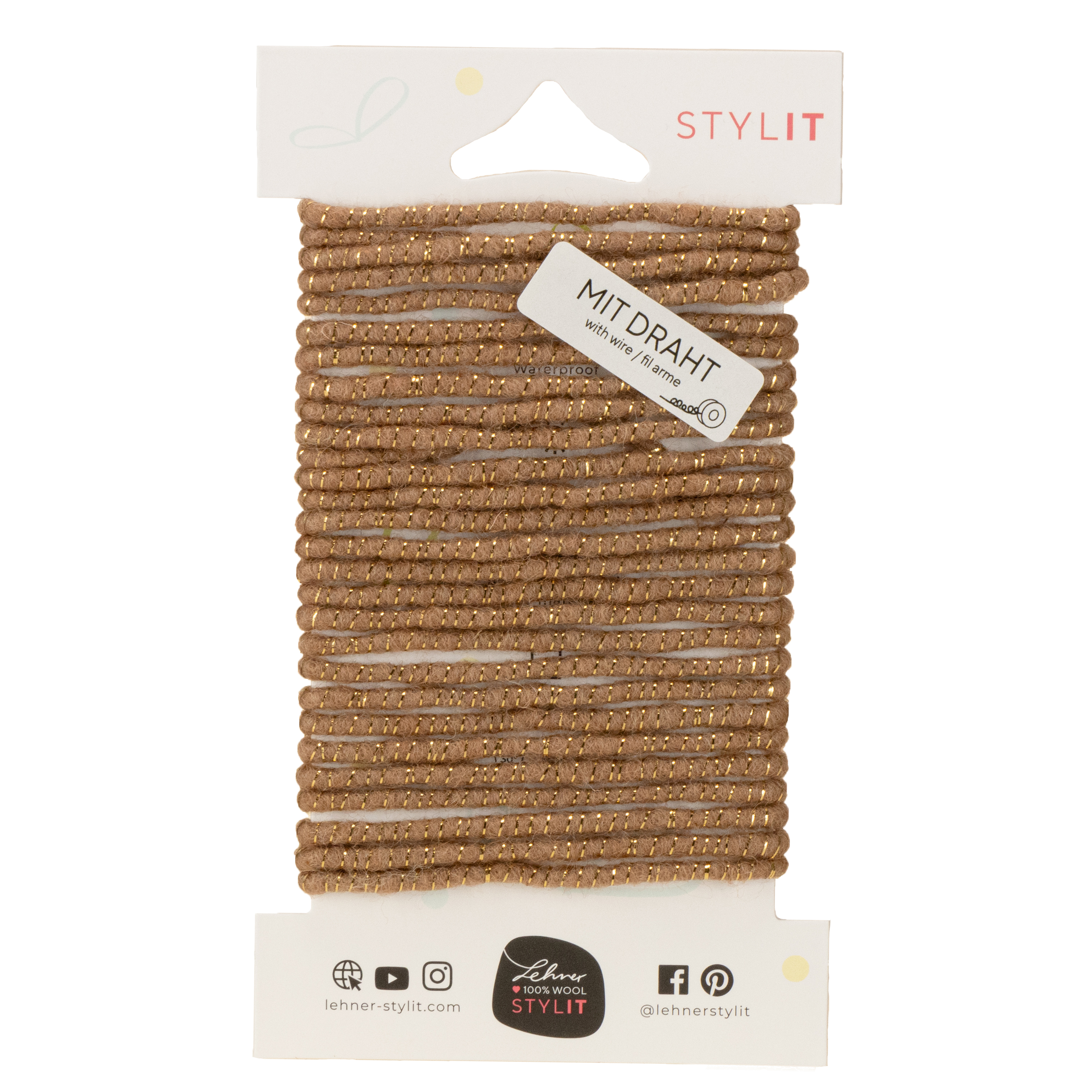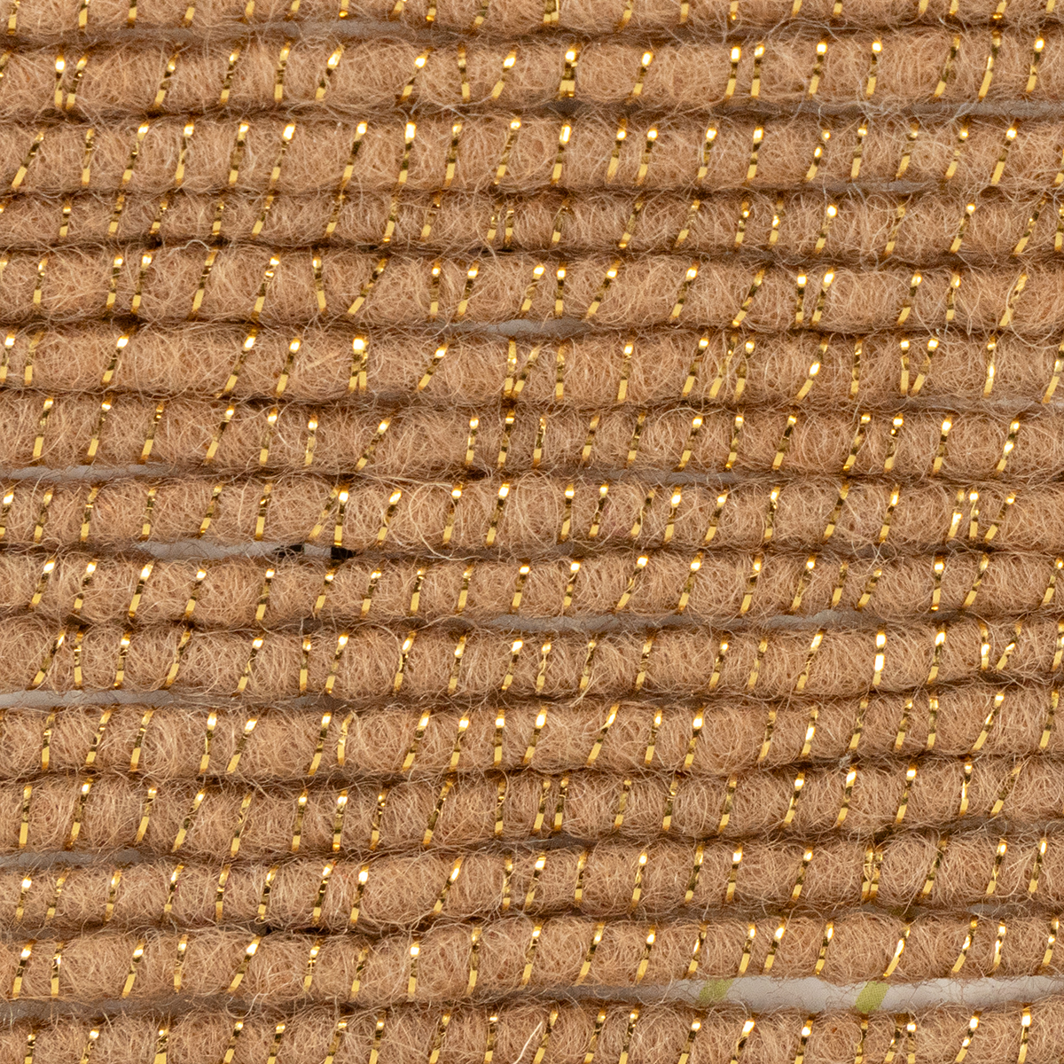 Tämä ruskean ja kullanvärinen villalanka on todellinen monitoimityökalu sisustukseen, askarteluun ja luoviin projekteihin. Se on valmistettu 100 % villasta ja kudottu hienoilla, kimaltelevilla kultaisilla lurex-yksityiskohdilla, ja sen ulkonäkö on erityisen hienostunut. Täydellinen tuomaan lämmintä mutta eleganttia ilmettä mihin tahansa projektiin. Sisällä oleva integroitu lanka pitää langan muodossaan ja tekee siitä uskomattoman helpon taivuttaa kaikenlaisiin muotoihin – herkistä kääreistä rohkeampiin rusetteihin ja silmukoihin.