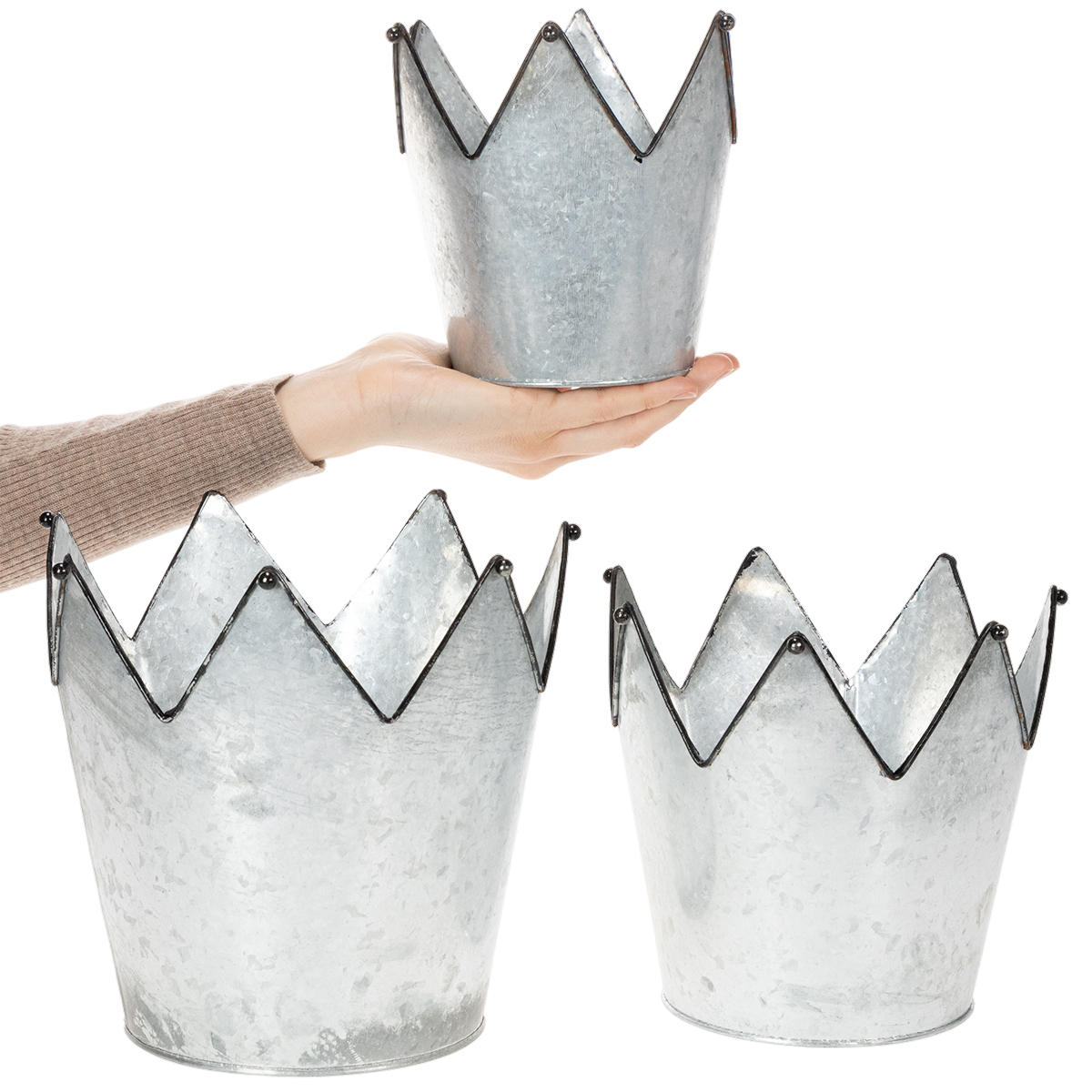 Viimeistele ikkunalaudasi ja lipastojasi näillä kolmella kruununmuotoisella istutuskoneella! Koristekruunut on valmistettu metallista, tarkemmin sanottuna sinkistä.
