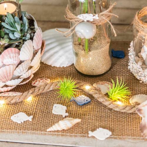 Merellinen sisustus on erittäin trendikäs, ja näillä valkoisilla hajakaloilla voit tuoda Pohjanmeren tunnelman kotiisi! Hienot kalahahmot on valmistettu ohuesta puuviipaleesta, ja niissä näkyy kala sivulta, jossa on pieniä syvennyksiä. Evien lisäksi puuhahmon suloinen suu, joka on muotoiltu suutelusuuksi, on myös nähtävissä. Voit esimerkiksi herkulliseen kalaillalliseen kotonasi, puinen kala ripotellaan löysästi pöydän keskelle, jotta vieraat saadaan tunnelmaan tulevaa ateriaa varten.Oikein käytännöllinen on se, että puinen hahmo näkyy molemmilta puolilta, eikä sitä näin ollen tarvitse erityisesti järjestää. Voit myös laittaa kalat kulhoon kynttilän, rottinkipallon tai majakan pienoiskoossa. Mutta myös askartelumateriaalina puukala näyttää erityisen fiksulta: kiinnitä se esimerkiksi istutusastiaan, lahjapakkaukseen tai onnittelukorttiin. Mutta voit myös luoda upean merikoristeen koristeellisilla kaloilla, simpukoilla, hiekalla, ajopuulla ja pienellä puulaivalla, joka kiehtoo kaikkia. Pysy luovana ja kokeile!