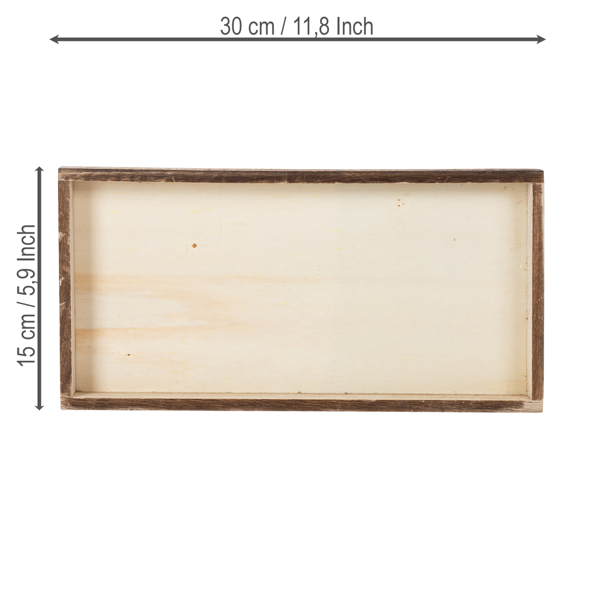 Tästä suorakaiteen muotoisesta puisesta tarjottimesta tulee nopeasti uusi suosikkikotikumppanisi – olipa kyseessä sitten käytännön tarkoitus tai koriste-esine kodissasi. 30 cm pitkä, 15 cm leveä ja 3 cm korkea tarjotin tarjoaa runsaasti tilaa arkipäiväisille tavaroille, kuten avaimille, kynille tai maustepurkeille. Samalla se on myös täydellinen esittelytila koristeillesi: asetteletpa sille tuoksukynttilöitä, hiekkaa ja simpukoita tai pienen kukka-asetelman – tämä tarjotin korostaa luovia ideoitasi ja luo siistin ja elegantin ilmeen.
