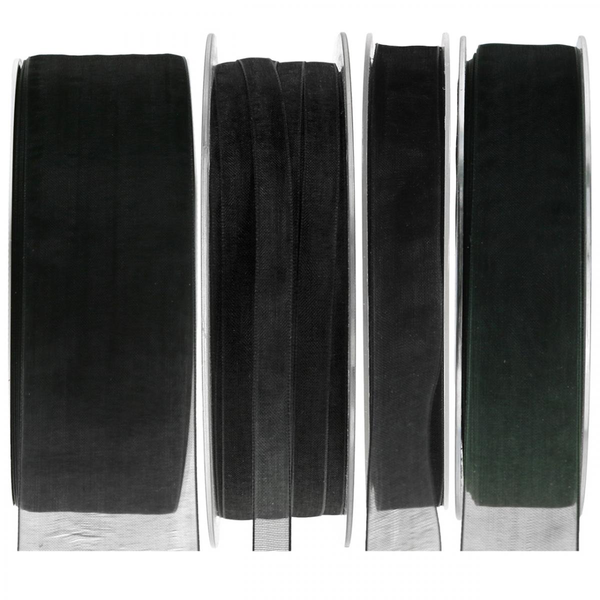 Jokainen organzanauha, jossa on musta helma, on rullattu tukevalle muovirullalle, joten se voidaan sijoittaa kätevästi annostelijalle. Jokainen nauha on noin 50 metriä pitkä.