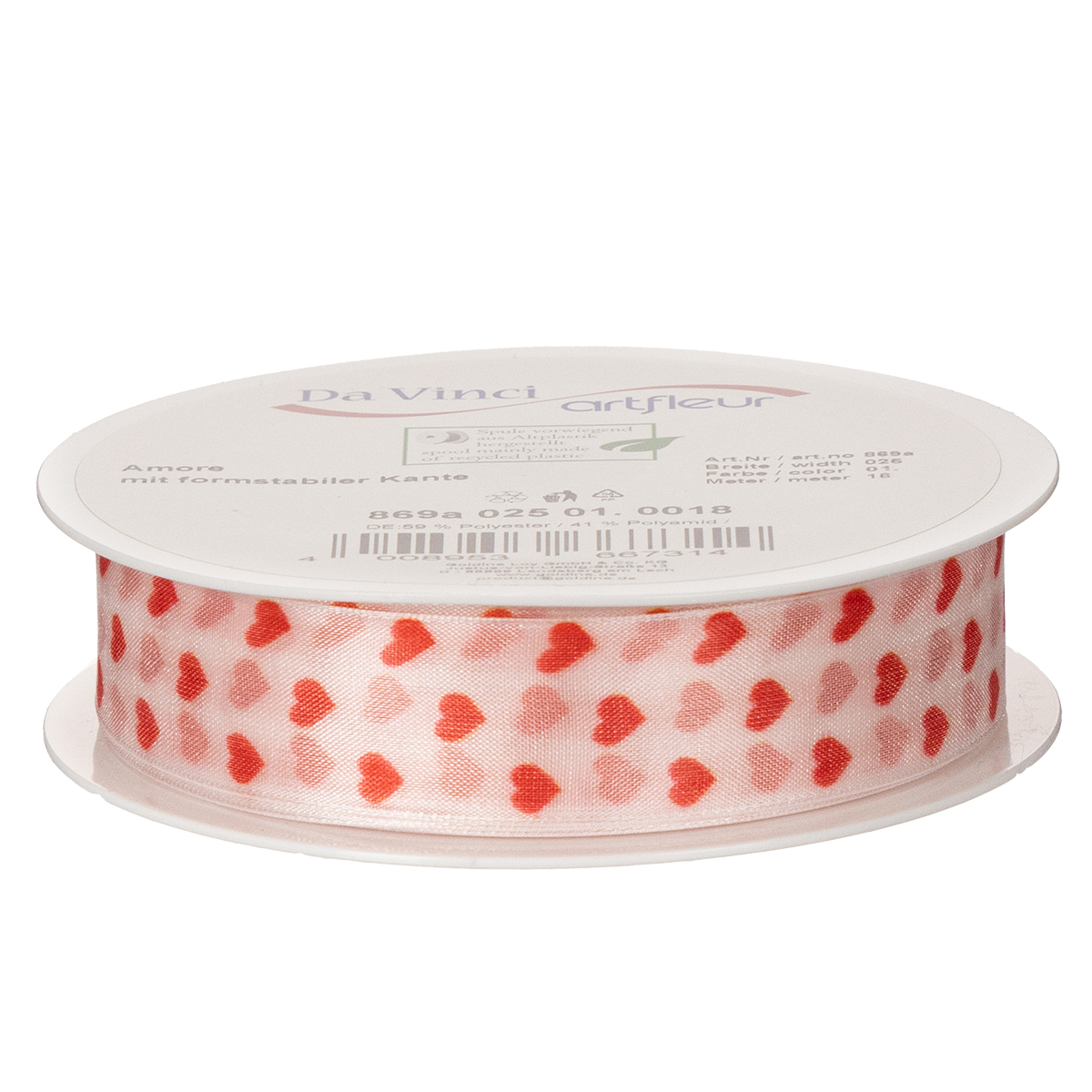 Tuotteen nimi: Sydämillä koristeltu lahjanauha, ihanteellinen luoviin pakkausideoihin ja henkilökohtaisiin lahjoihin, 2,5 cm leveä, 15 m pitkä