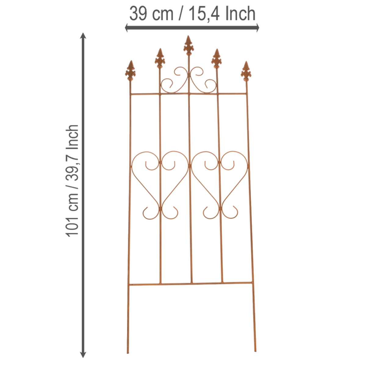 Haaveiletko puutarhasta, joka huokuu eleganssia ja romantiikkaa? Tämä koristeellinen sydänaiheinen säleikkö tuo juuri sitä kotiisi! Rakkaudella muotoiltu sydämenmuoto ja hienostunut ruosteenruskea viimeistely lisäävät tyylikkään silauksen – todellinen kohokohta puutarhapoluille, kukkapenkkeihin tai patiolle. Tuetpa sitten köynnösruusuja tai reheviä viiniköynnöksiä, tämä säleikkö tarjoaa optimaalisen tuen ja sulautuu harmonisesti mihin tahansa puutarhasuunnitteluun. Korkealaatuisesta metallista valmistettu ja tyylikkäästi ruskeaksi viimeistelty se yhdistää estetiikan ja toimivuuden. Täydellinen sekä sisä- että katettuihin ulkotiloihin.