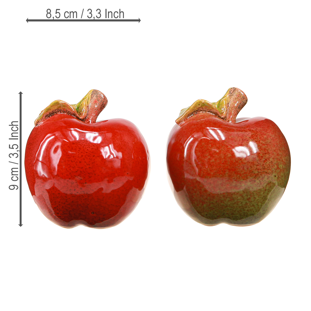 Keraamisina syyskoristeina nämä kirkkaanpunaiset ja punavihreät omenat ovat täydellinen tunnelmanluonti kattaukseen. Nämä koristeelliset omenat luovat lämpimän ja kutsuvan tunnelman mihin tahansa huoneeseen. Kiiltävän lasitteensa ja yksityiskohtaisten, veistettyjen lehtiensä ja varsiensa ansiosta ne herättävät luonnon kauneuden eloon kotiisi. Keraamiset omenat sopivat erinomaisesti syksyisiin juhlapöytiin tai tyylikkäiksi koristeiksi olohuoneeseen, hyllyille tai ikkunalaudoille. Nämä tukevat keinotekoiset hedelmät eivät ole vain katseenvangitsija syksyisissä pöytäkoristeluissa, vaan niitä voidaan käyttää myös kynttiläasetelmissa, toimistossa tai kaupoissa. Niiden korkealaatuinen työnjälki ja klassinen muotoilu sopivat täydellisesti sekä moderniin että klassiseen sisustustyyliin.