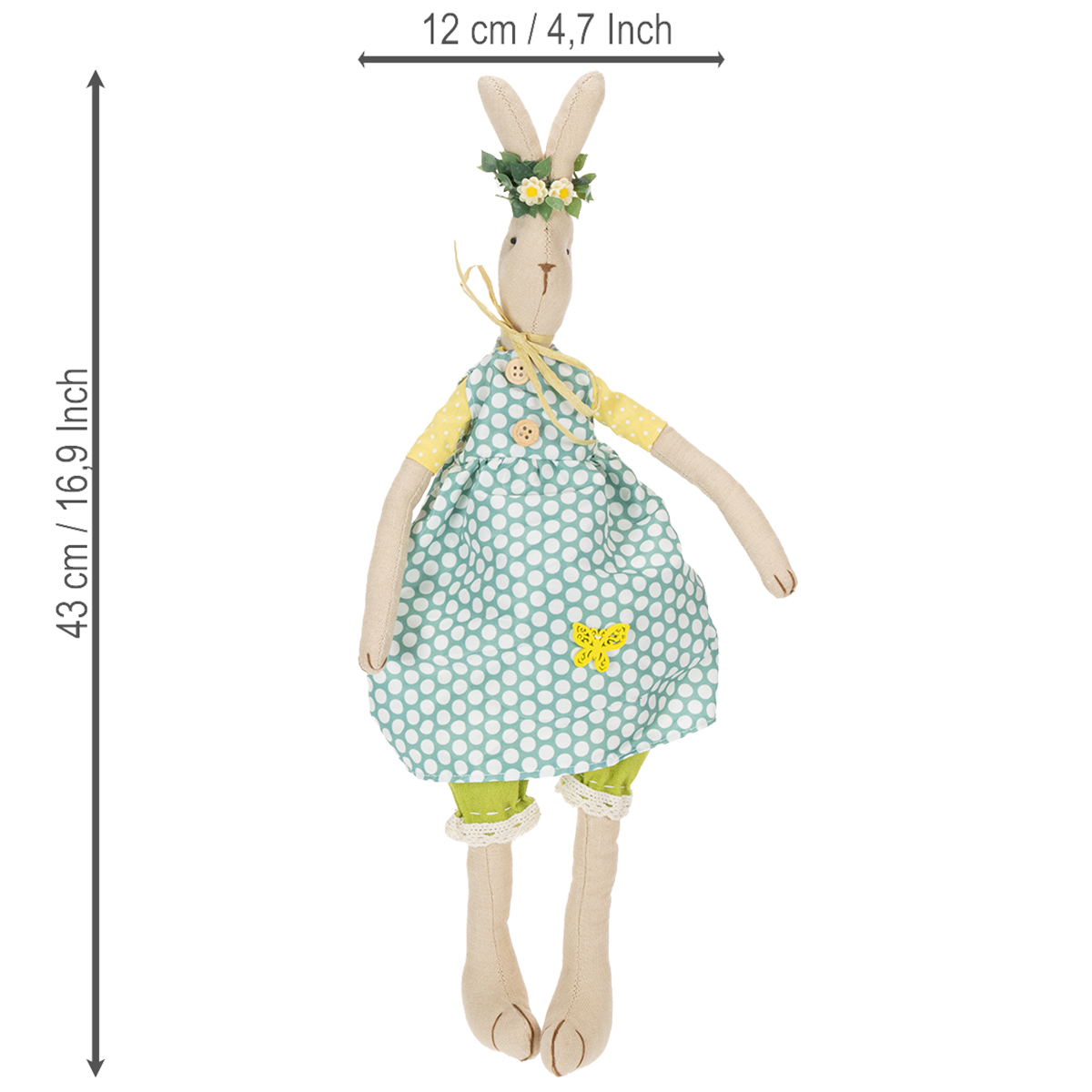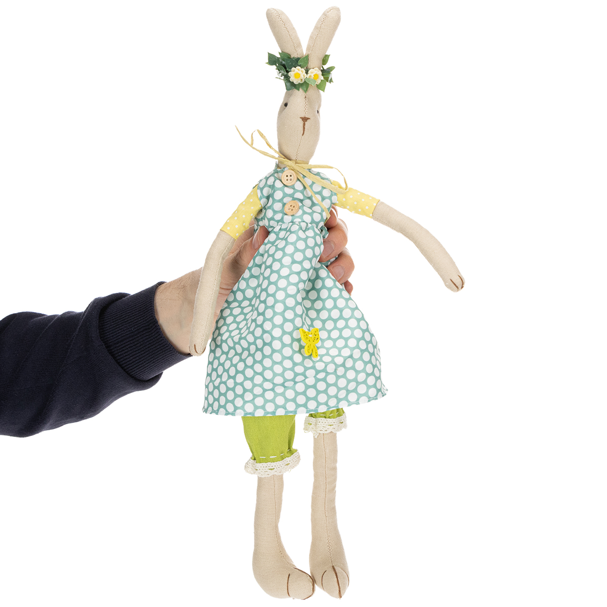 Puuvillatäytteen ansiosta koristepupu on mukava ja pehmeä ja täysin liikkuva. Hihat on ommeltu pääsiäisfiguuriin, mutta mekko ja housut ovat tarvittaessa irrotettavissa. Voit siis olla myös itse luova pukeaksesi kankaasta valmistettua pääsiäispupua pääsiäiskoristeluideoiden mukaan.