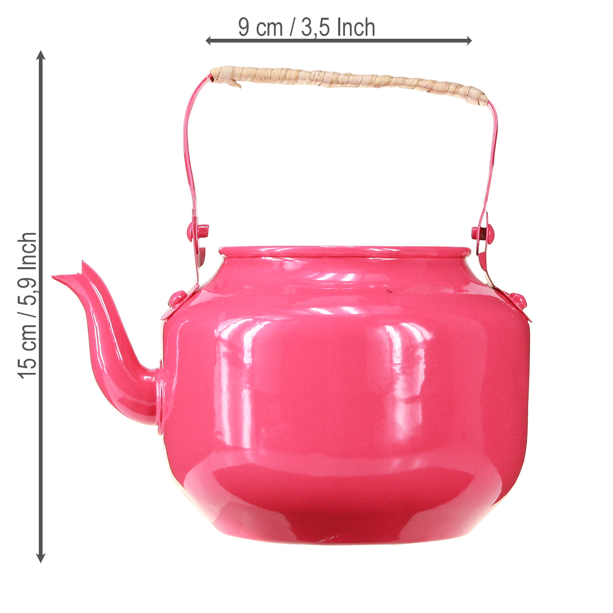 Miksi juuri tämä teekannu? Sen kätevä koko, 15 cm korkea ja 11 cm halkaisijaltaan, tekee siitä monipuolisen esineen, joka toimii sekä koristeena että käytännöllisenä käyttötarkoituksena. Vaaleanpunainen väri on raikas ja iloinen, mutta silti tarpeeksi klassinen ollakseen liian hallitseva. Kestävä metallimateriaali takaa kestävyyden ja vakauden, kun taas rustiikkinen kahva bambuyksityiskohdilla täydentää täydellisesti maalaisromanttista tunnelmaa.