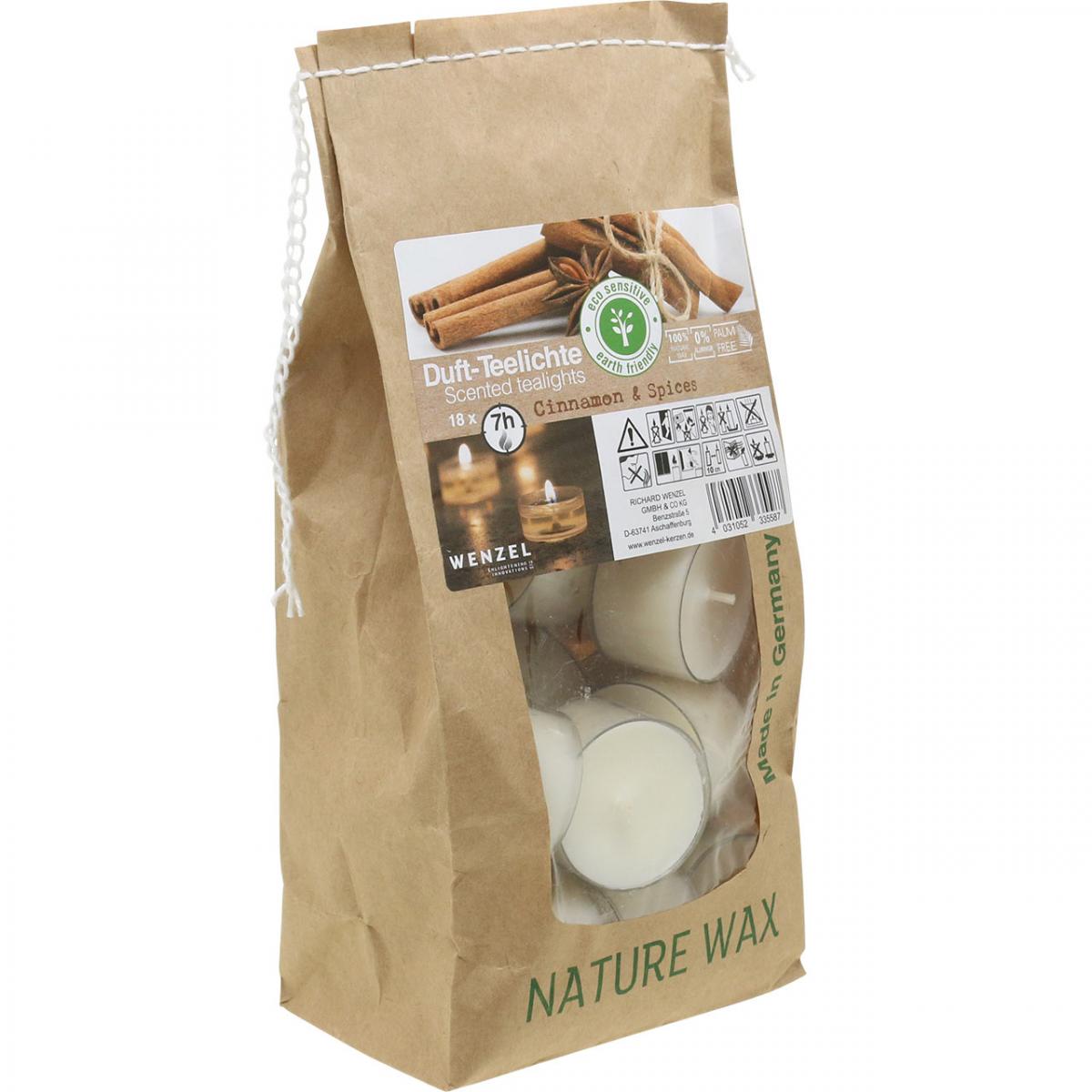 Kanelin tuoksuiset kynttilät on valmistettu luonnonvahasta, palmuöljyttömät ja alumiinittomat, 100 % valmistettu Saksassa. Tuoksukynttilät ovat RAL-sertifioituja ja niiden paloaika on noin 7 tuntia.