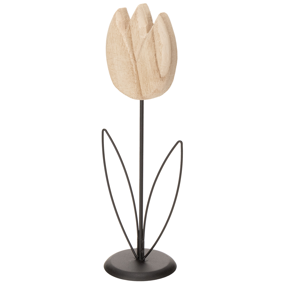Tämä tulppaani-koristeinen esine erottuu edukseen yksinkertaisen mutta ilmeikkään muotoilunsa ansiosta. Tulppaanin muotoinen pää on valmistettu korkealaatuisesta puusta, jonka luonnollinen syykuvio antaa sille erityisen autenttisen ilmeen. Lehdet, varsi ja tyvi on valmistettu tukevasta metallista, mikä takaa vakauden. Piditpä sitten modernista, skandinaavisesta tai ajattomasta sisustustyylistä, tämä koristeellinen tulppaani sulautuu saumattomasti mihin tahansa ympäristöön. Se näyttää erityisen kauniilta yhdistettynä muihin metallista tai puusta valmistettuihin koriste-esineisiin – esimerkiksi pienessä asetelmassa kynttilöiden tai maljakoiden kanssa.
