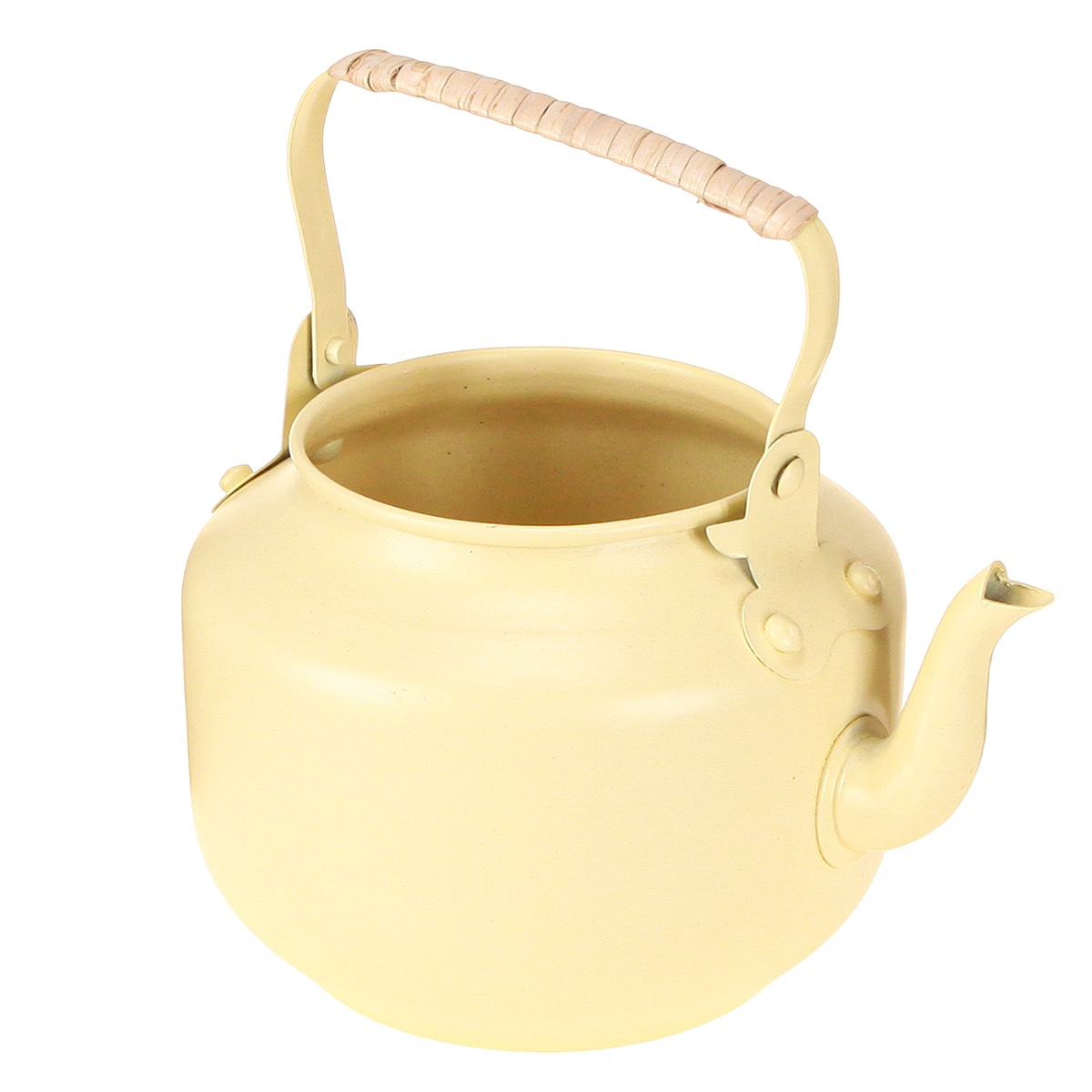 Tämä koristeellinen keltainen teekannu on kaunis esimerkki perinteisestä käsityötaidosta ja harkitusta maalaistyylisestä suunnittelusta. Kestävästä metallista valmistettu teekannu huokuu sekä näkyvää että käsin kosketeltavaa kestävyyden tunnetta. Pehmeä kermanväri hienovaraisine keltaisine vivahteineen sopii monenlaisiin sisustustyyleihin – maalaismaisesta retroviehätyksestä moderniin shabby chiciin. Erityisen huomionarvoinen ominaisuus on luonnonmateriaaliin verhoiltu puinen kahva, joka on paitsi visuaalisesti miellyttävä, myös mukava kädessä.
