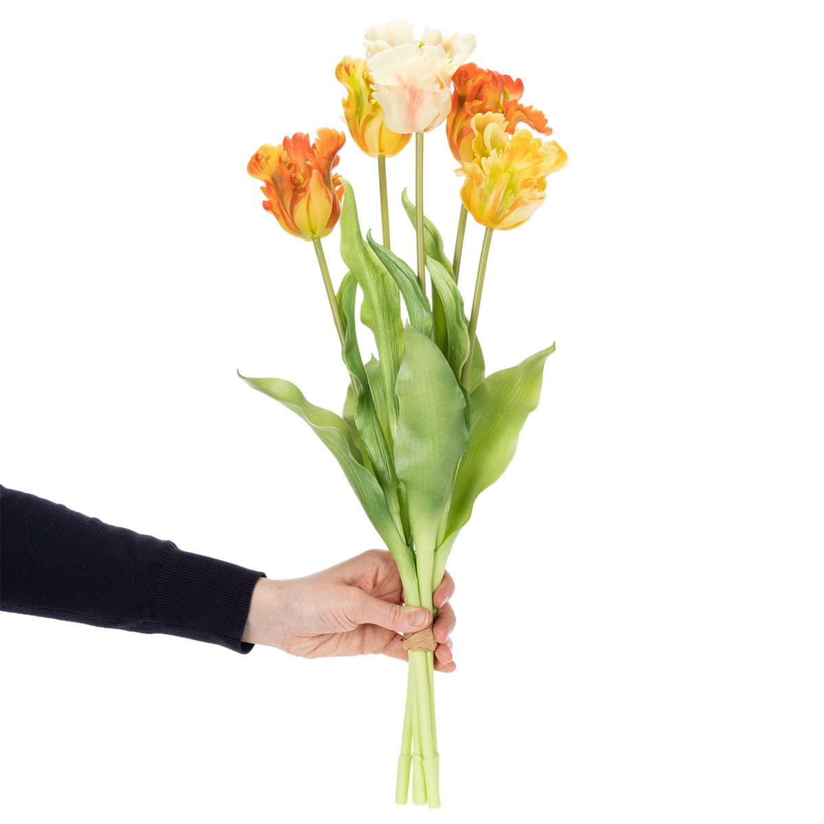 Entäpä jos muuttaisit olohuoneesi kukkivaksi kevätpuutarhaksi – täysin huoltovapaaksi? Korkealaatuiset tekokukat eloisan oranssissa värissä sopivat tähän täydellisesti! Olipa kyseessä sitten vaikuttava keskipiste aamiaiselle ystävien kanssa tai silmiinpistävä korostus lipastossa, nämä koristeelliset tulppaanit tuovat raikkautta ja eleganssia mihin tahansa huoneeseen. Ne näyttävät niin aidoilta, että sinun täytyy katsoa kahdesti tajutaksesi, etteivät ne ole aitoja. Ja mikä parasta: eivät nuutu, ei kastelua, eivätkä haalistu. Nämä tekokukat sopivat lukemattomiin sisustustyyleihin – modernista maalaismaiseen. Niiden viehättävä yhdistelmä eloisaa oranssia ja herkkiä, luonnollisen näköisiä lehtiä tekee niistä paitsi olohuoneen suosikin, myös monipuolisen lisän erityistilaisuuksiin, kuten häihin, syntymäpäiväjuhliin tai kevätkoristeisiin. Hemmottele itseäsi palasella kevättä, joka ei koskaan haalistu!